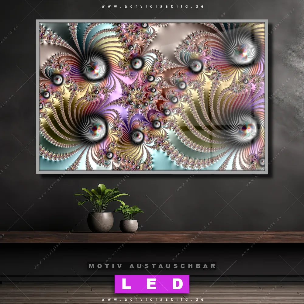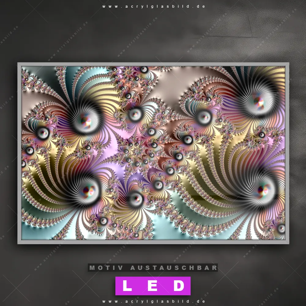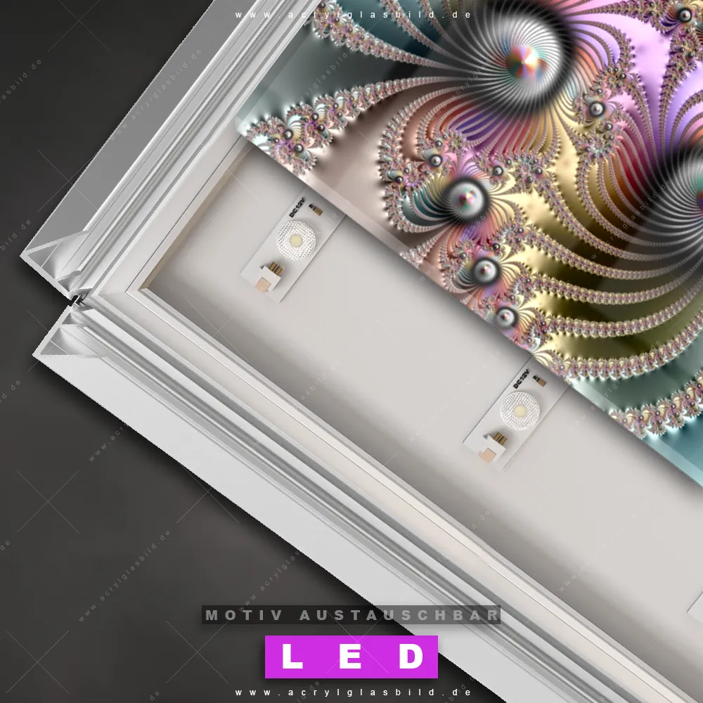 Du bist auf der Suche nach einem dimmbaren Muster - Texturen LED Bild mit Fernbedienung und optionaler Farbtemperatursteuerung? Dann haben wir hier genau das richtige Wandbild mit LED Beleuchtung für dich: Unser Canvalight® DIA LED Acrylglasbild Fraktale Kunst No.1 im Querformat mit austauschbarer bedruckter Acrylglas-Scheibe. Dieses Leuchtbild bringt sofort Partybeleuchtung in deine Räume!
