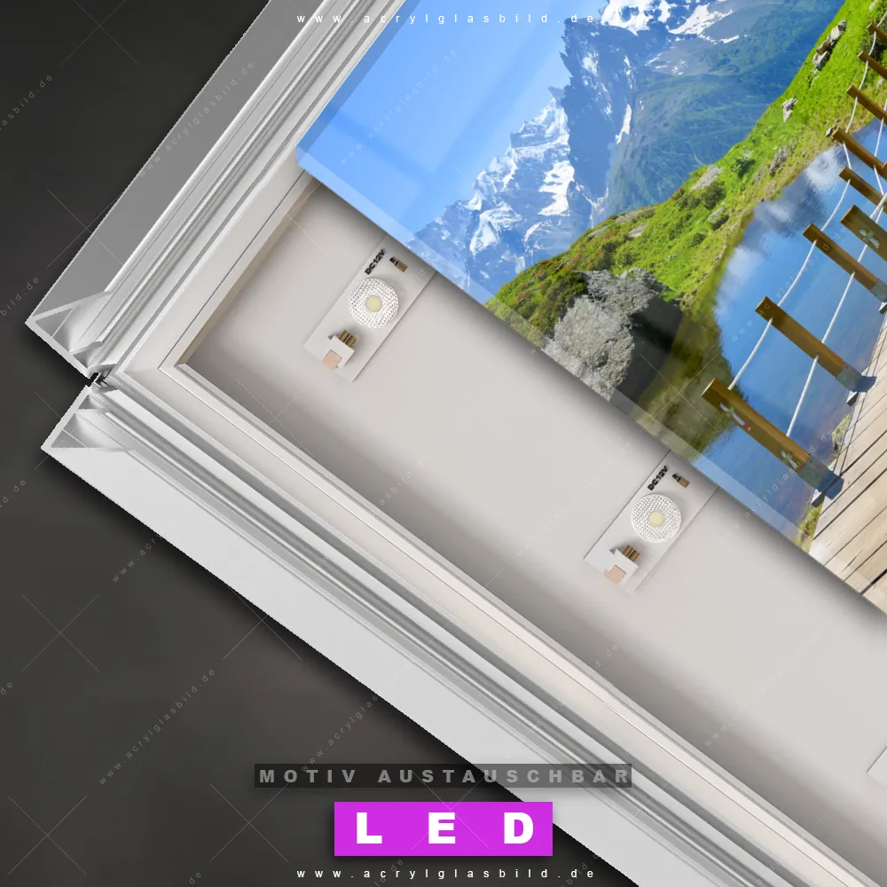 Bist du bereit, deine Wände mit einem dimmbaren LED Bild mit Fernbedienung und optionaler Farbtemperatursteuerung zum Leuchten zu bringen? Wir haben das ultimative Landschaften LED Acrylglasbild Canvalight® DIA für dich! Unser LED Wandbild aus Acrylglas Französische Alpen im Quadratischen Format mit austauschbarer bedruckter Acrylglas-Scheibe im DIA-Klapprahmen bringt sofort jede Menge Glanz in deine vier Wände.