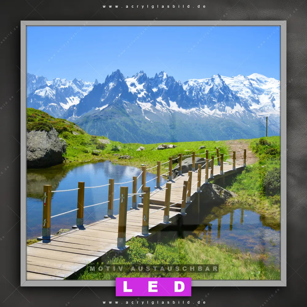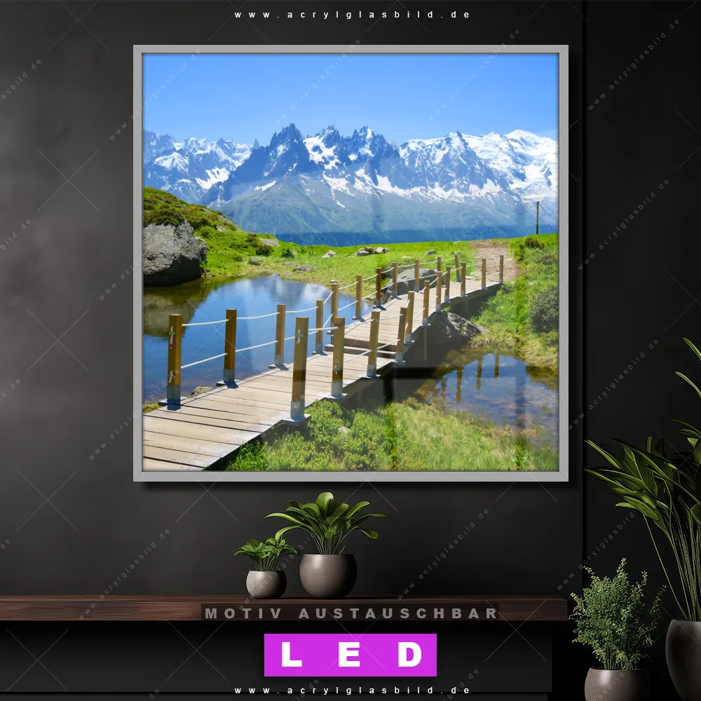 Vergiss dunkle Ecken und Langeweile! Mit unserem Acrylglasbild Mont Blanc-Gebirge und seiner brillanten LED-Ausleuchtung wirst du dich nie wieder in der Dunkelheit verirren. Wenn du auf der Suche nach einem beleuchteten Wandbild aus Acrylglas mit Steg, Berge, Bergsee, Gebirge, Wiese, wandern, See, Urlaub, Reisen, Brücke, Natur bist, ist unser LED Acrylglasbild Canvalight® DIA Idyllische Landschaft mit Bergen mit den strahlenden Motiv-Farben Grün, Blau, Weiss, Braun, Beige genau das richtige Leuchtbild für dich. Das im Natürlich - Realistisch Stil gestaltete LED Bild mit glänzender Front aus Acrylglas passt perfekt zu jedem Einrichtungsstil in Arzt - Praxis, Büro - Kanzlei, Wohnzimmer - Schlafzimmer – vom minimalistischen Chic bis zum kreativen Chaos.