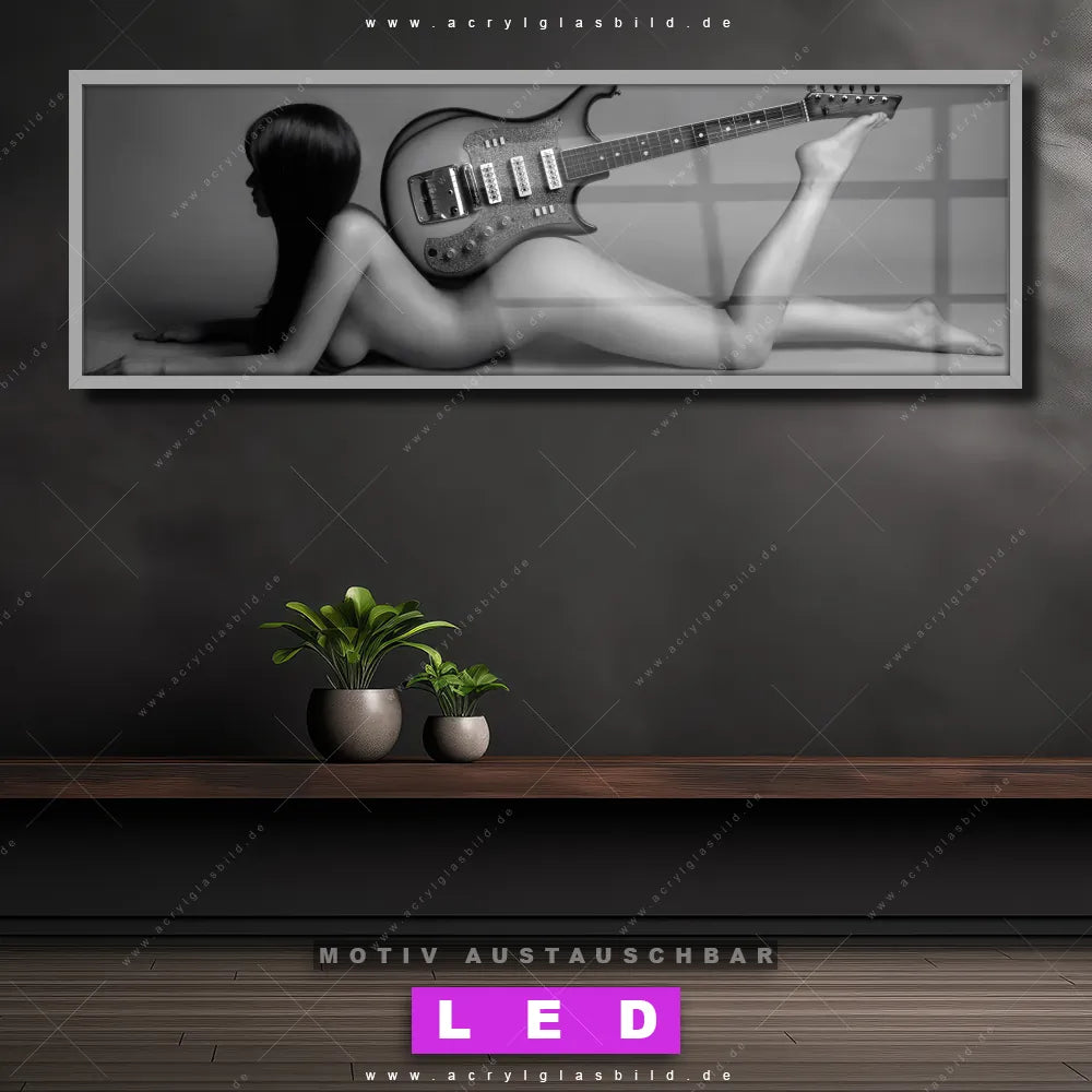 Wer will schon dunkle, triste Wände? Mit unserem LED Acrylglasbild Canvalight® DIA erotische Pose einer Frau mit Gitarre und seiner fantastischen LED-Ausleuchtung werden deine Wände in Wohnzimmer - Schlafzimmer zu echten Hinguckern. Wenn du auf der Suche nach einem beleuchteten Wandbild aus Acrylglas mit Frau, Erotik, modern, Beauty, Körper, Body, Akt, Musik, Gitarre, Instrument bist, dann solltest du unser LED Leuchhtbild Seitenprofil einer nackten Frau mit Gitarre auf dem Rücken mit den beeindruckenden Motiv-Farben Schwarz, Weiss nicht verpassen. Gestaltet im angesagten Natürlich - Realistisch Stil, passt das LED Bild mit DIA-Klapprahmen und wechselbarer Acrylglas-Scheibe perfekt zu jedem Einrichtungsstil – selbst in deinem kleinen Dschungel aus Kreativität und Chaos!