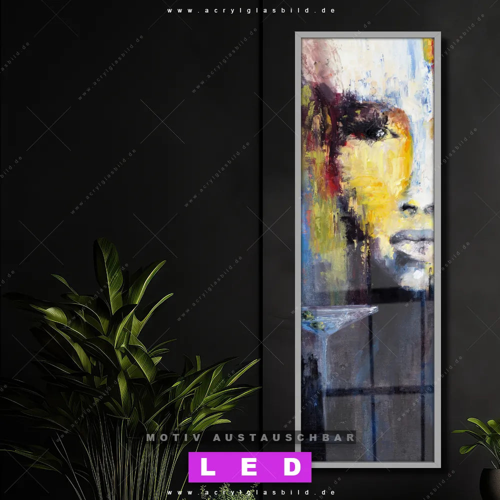Vergiss dunkle Ecken und langweilige Wände in Wohnzimmer - Schlafzimmer, Bar - Gastronomie, Friseur - Beauty! Mit unserem LED Acrylglasbild Canvalight® DIA abstraktes Gesichtsporträt einer Frau wirst du nie wieder im Dunkeln tappen. Suchst du nach einem beleuchteten Wandbild mit Abstrakt, Modern, Kunst, Gemälde, Ölfarbe, Leinwand, Frau, Portrait, Martini, Cocktail? Dann ist unser Leuchtbild weibliches Gesicht mit Glas mit den strahlenden Motiv-Farben Blau, Weiss, Gelb , Rot, Schwarz genau das richtige LED Bild für dich. Egal, ob dein Stil minimalistisch oder exotisch ist, dieses LED Leuchtbild im Abstrakt, Modern Art Stil mit DIA-Klapprahmen und glänzender Front aus Acrylglas passt perfekt zu jeder Einrichtung.