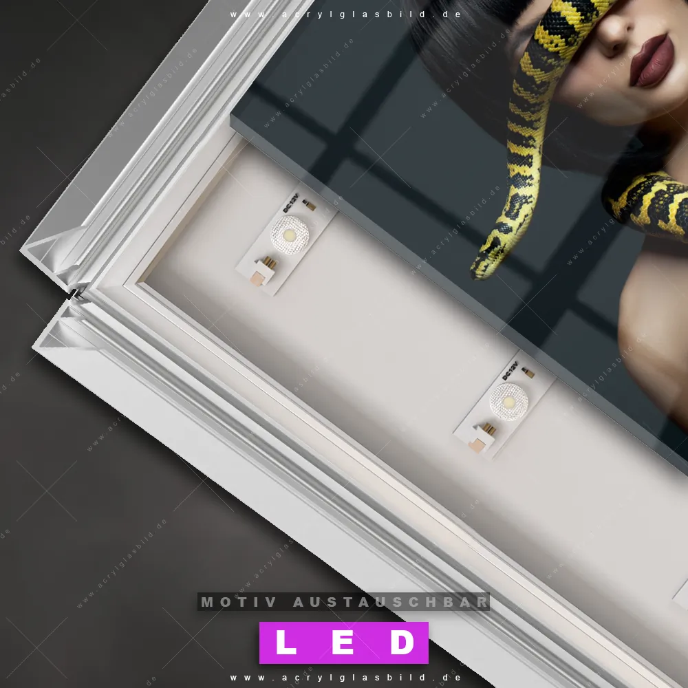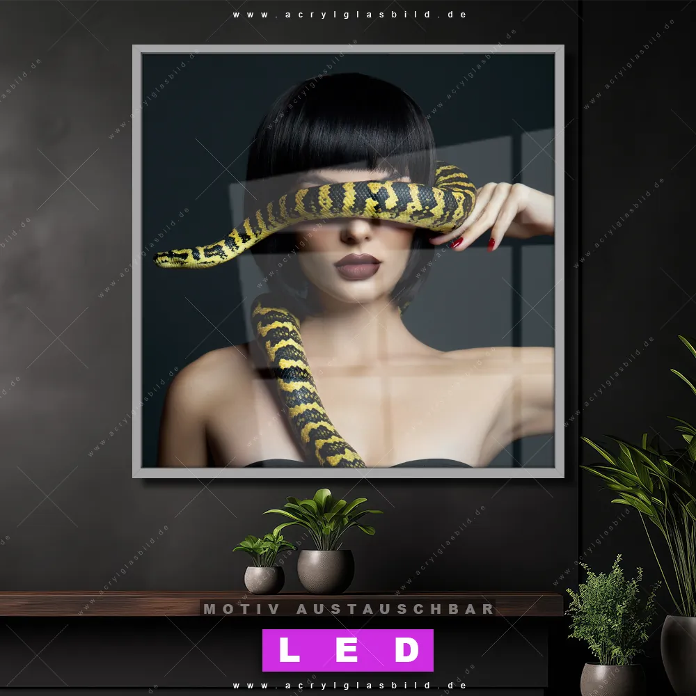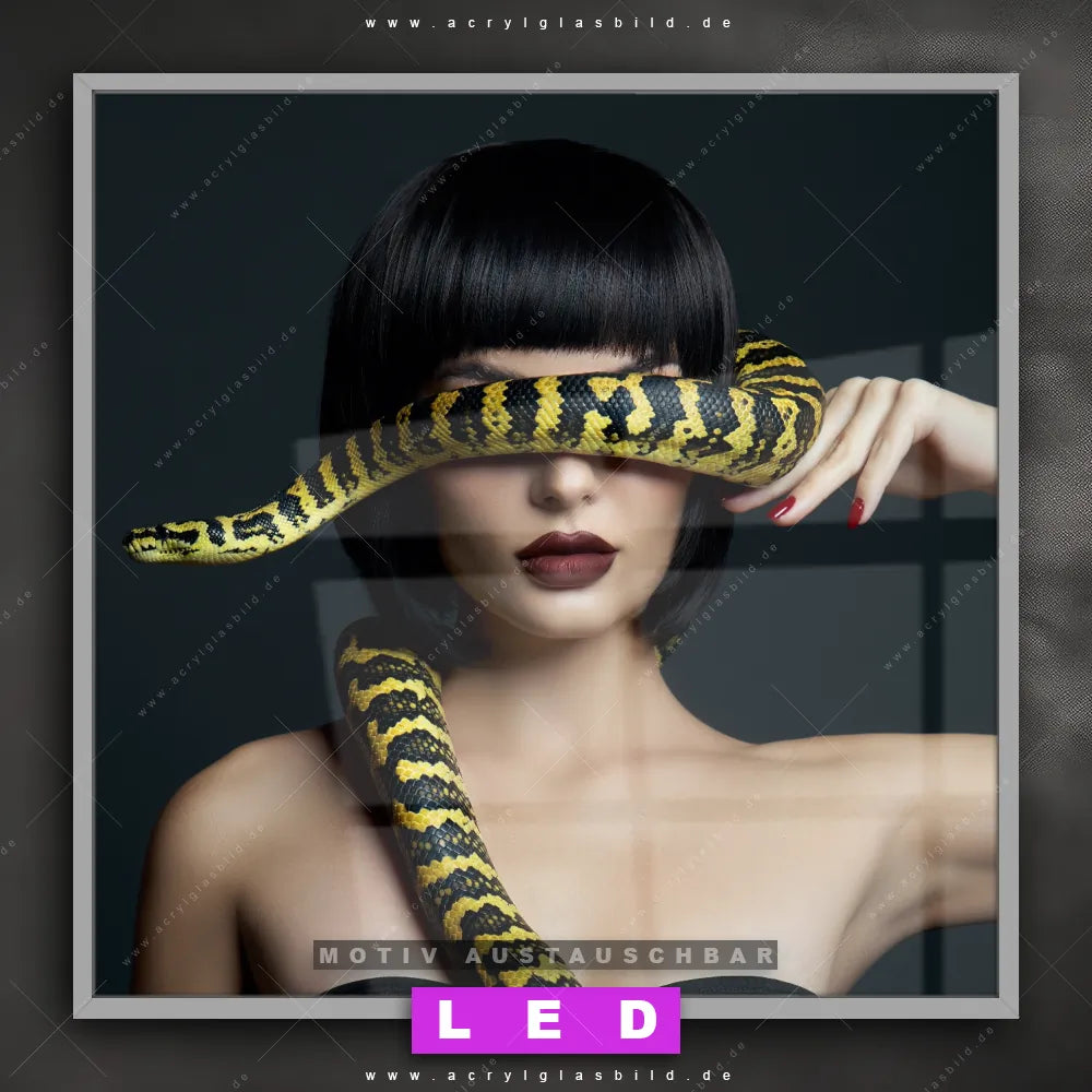 Bist du bereit, deine Wände mit einem dimmbaren LED Bild mit Fernbedienung und optionaler Farbtemperatursteuerung zum Leuchten zu bringen? Wir haben das ultimative Porträts - Menschen, Tierwelt LED Acrylglasbild Canvalight® DIA für dich! Unser LED Wandbild aus Acrylglas Frau mit gelber Schlange im Quadratischen Format mit austauschbarer bedruckter Acrylglas-Scheibe im DIA-Klapprahmen bringt sofort jede Menge Glanz in deine vier Wände.
