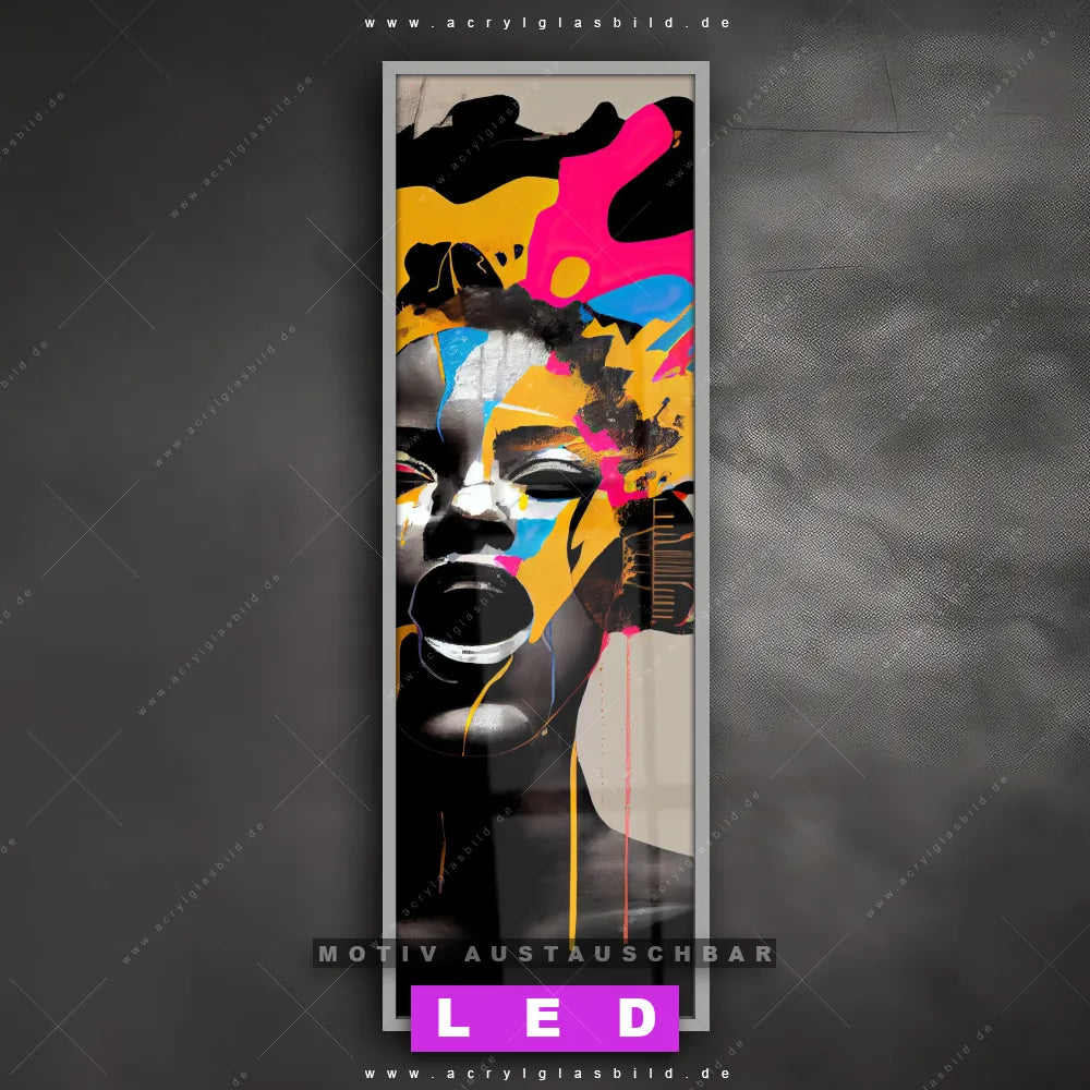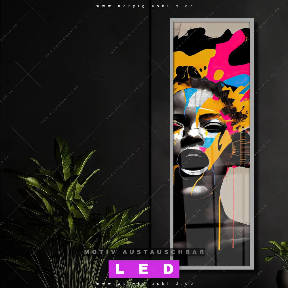 Vergiss dunkle Ecken und langweilige Wände in Wohnzimmer - Schlafzimmer, Bar - Gastronomie, Friseur - Beauty, Flur - Eingangsbereich! Mit unserem LED Acrylglasbild Canvalight® DIA Musik in bunten Farben wirst du nie wieder im Dunkeln tappen. Suchst du nach einem beleuchteten Wandbild mit Frau, Portrait, Gesicht, Mädchen, Dame, Farbe, Musik, Kopfhörer? Dann ist unser Leuchtbild Buntes Gesicht einer musikalischen Frau mit den strahlenden Motiv-Farben Beige, Schwarz, Orange, Pink genau das richtige LED Bild für dich. Egal, ob dein Stil minimalistisch oder exotisch ist, dieses LED Leuchtbild im Abstrakt, Modern Art Stil mit DIA-Klapprahmen und glänzender Front aus Acrylglas passt perfekt zu jeder Einrichtung.