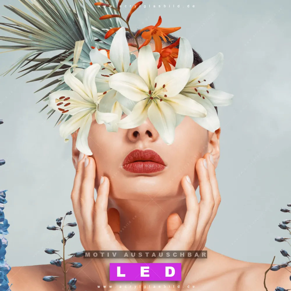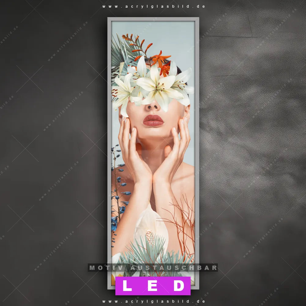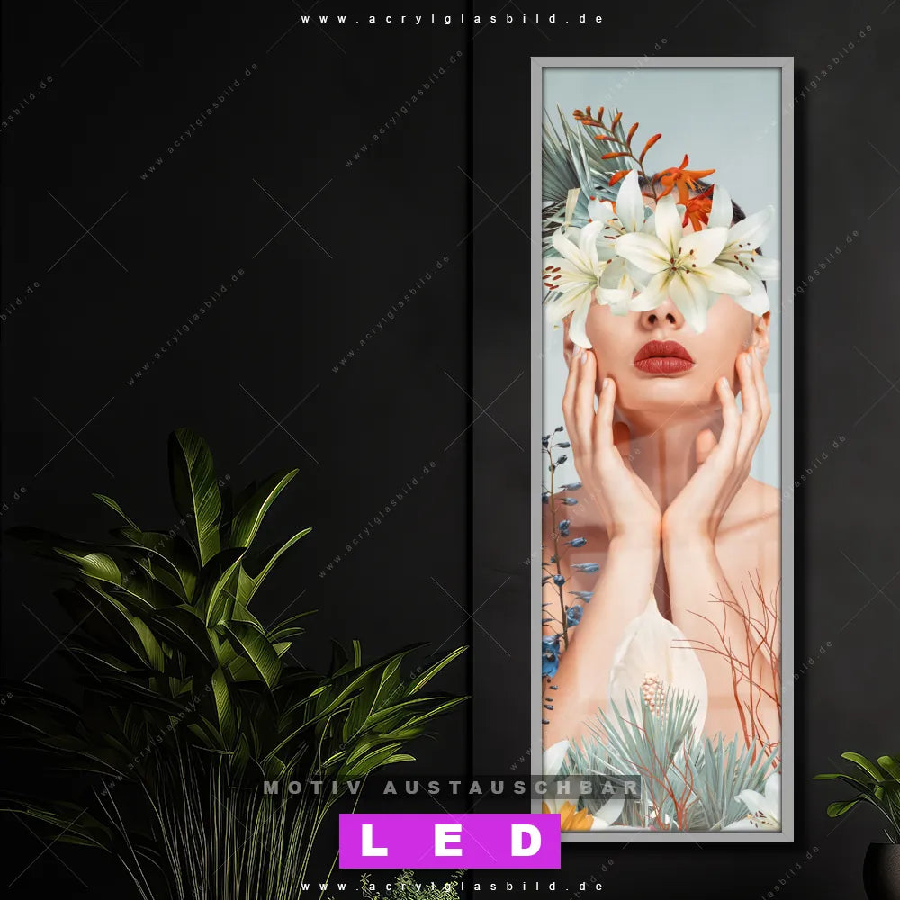 Bist du bereit, deine Wände mit einem dimmbaren LED Bild mit Fernbedienung und optionaler Farbtemperatursteuerung auf das nächste Level zu bringen? Unser Porträts - Menschen, Blumen - Botanik Canvalight® DIA LED Acrylglasbild ist genau das, was du brauchst! Das Wandbild mit LED Beleuchtung im Schmalen Format mit austauschbarer bedruckter Acrylglas-Scheibe Frauenportrait mit Blumen bringt Licht und Stil in dein Zuhause – und das in null Komma nichts!