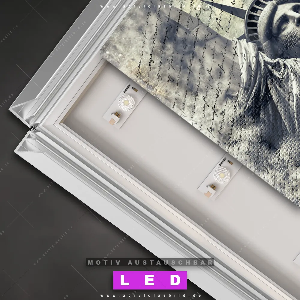Bist du bereit, deine Wände mit einem dimmbaren LED Bild mit Fernbedienung und optionaler Farbtemperatursteuerung zum Leuchten zu bringen? Wir haben das ultimative Städte - Skylines LED Acrylglasbild Canvalight® DIA für dich! Unser LED Wandbild aus Acrylglas Freiheitsstatue im Sandsturm im Quadratischen Format mit austauschbarer bedruckter Acrylglas-Scheibe im DIA-Klapprahmen bringt sofort jede Menge Glanz in deine vier Wände.