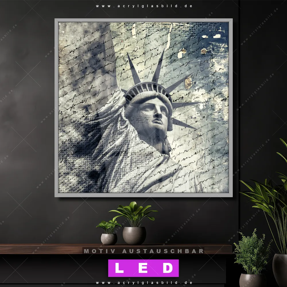 Vergiss dunkle Ecken und Langeweile! Mit unserem Acrylglasbild Künstlerische Freiheitsstatue mit Schriftzug und seiner brillanten LED-Ausleuchtung wirst du dich nie wieder in der Dunkelheit verirren. Wenn du auf der Suche nach einem beleuchteten Wandbild aus Acrylglas mit Porträt, Grunge, Streetart, modern, Freiheitsstatue, Statue of Liberty, Amerika, USA bist, ist unser LED Acrylglasbild Canvalight® DIA Freiheitsstatue auf Texturhintergrund mit den strahlenden Motiv-Farben Blau, Grau , Beige, Weiss, Gold genau das richtige Leuchtbild für dich. Das im Abstrakt, Grunge, Modern Art Stil gestaltete LED Bild mit glänzender Front aus Acrylglas passt perfekt zu jedem Einrichtungsstil in Arzt - Praxis, Bar - Gastronomie, Büro - Kanzlei, Flur - Eingangsbereich, Wohnzimmer - Schlafzimmer – vom minimalistischen Chic bis zum kreativen Chaos.