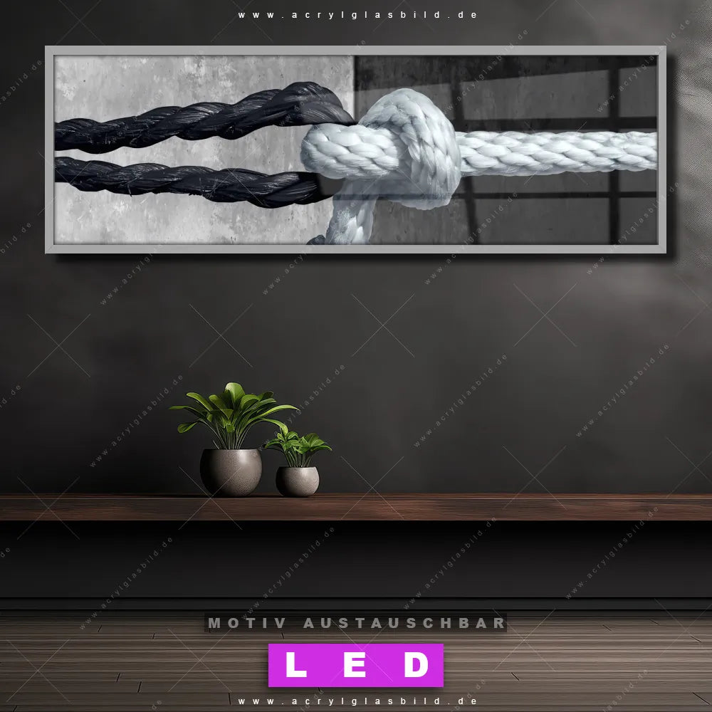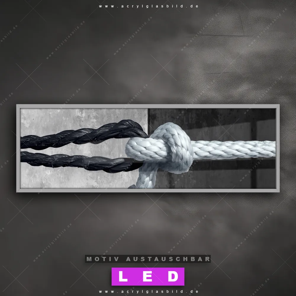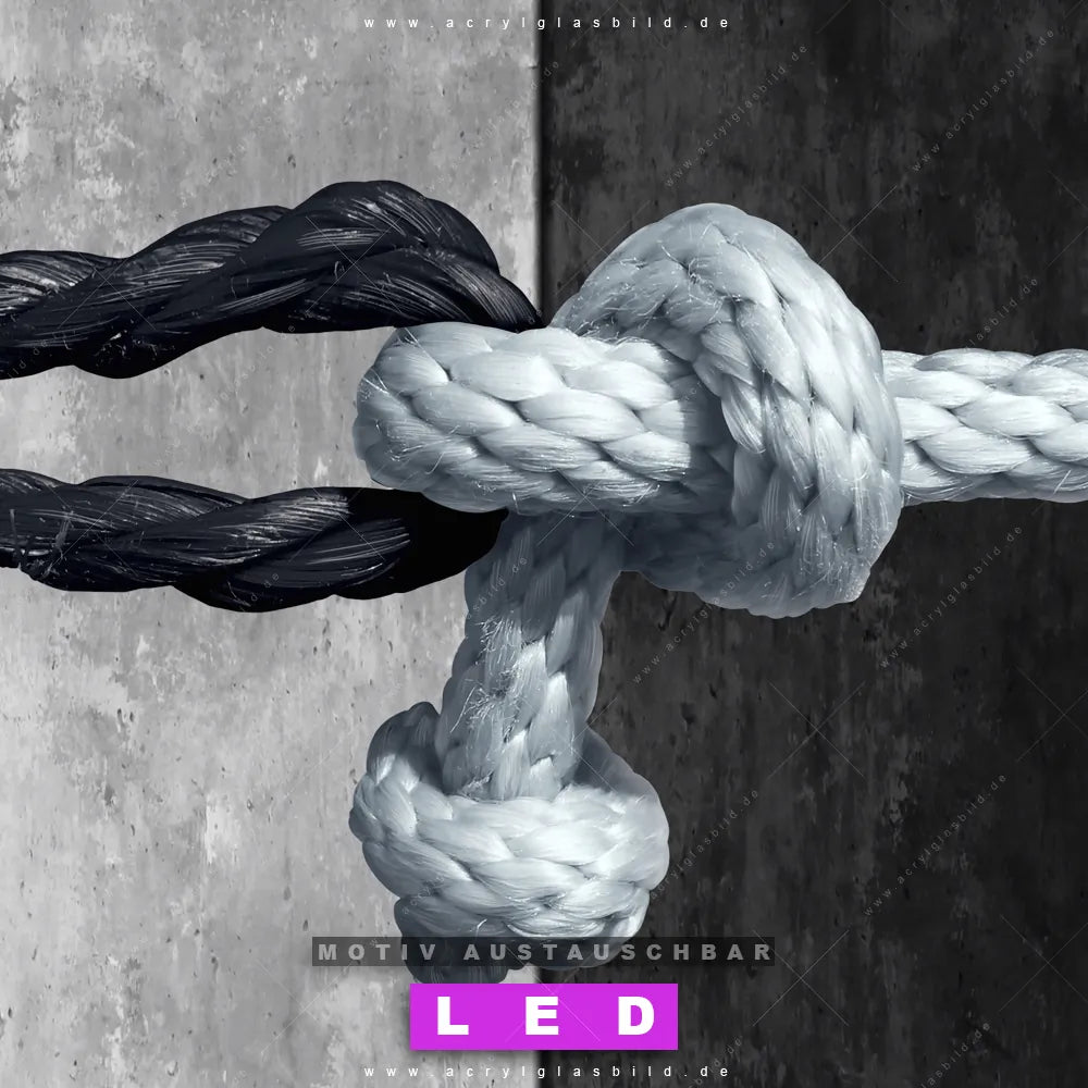 Wer will schon dunkle, triste Wände? Mit unserem LED Acrylglasbild Canvalight® DIA symbolisch verknotete Seile und seiner fantastischen LED-Ausleuchtung werden deine Wände in Arzt - Praxis, Büro - Kanzlei, Flur - Eingangsbereich zu echten Hinguckern. Wenn du auf der Suche nach einem beleuchteten Wandbild aus Acrylglas mit Yin Yang, Feng Shui, Buddhismus, Meditation, Zen, Religion bist, dann solltest du unser LED Leuchhtbild Symbolbild mit Seilen mit den beeindruckenden Motiv-Farben Weiss, Schwarz nicht verpassen. Gestaltet im angesagten Natürlich - Realistisch, Schwarz - Weiss Stil, passt das LED Bild mit DIA-Klapprahmen und wechselbarer Acrylglas-Scheibe perfekt zu jedem Einrichtungsstil – selbst in deinem kleinen Dschungel aus Kreativität und Chaos!