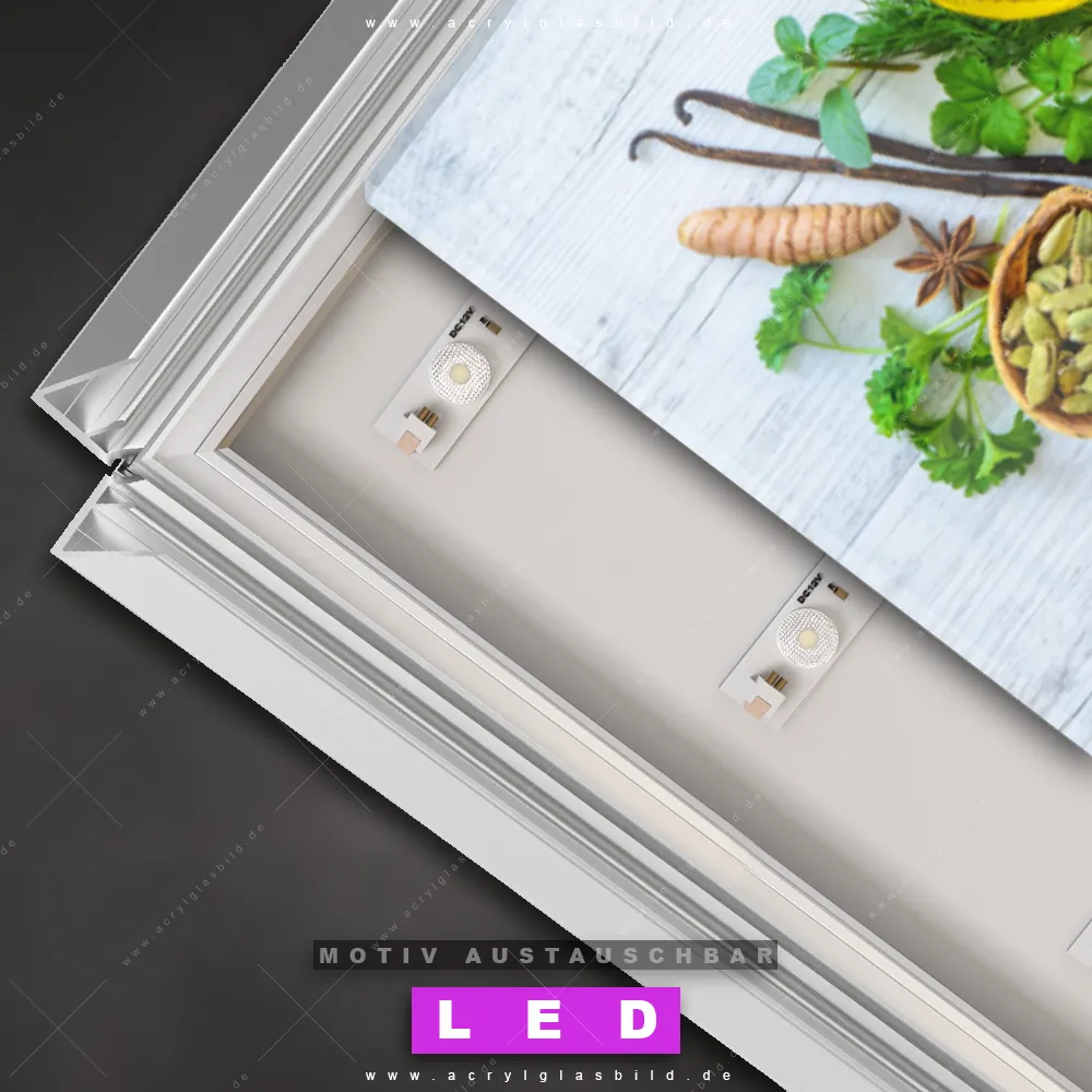 Wer will schon dunkle, triste Wände? Mit unserem LED Acrylglasbild Canvalight® DIA Gartenkräuter mit bunten Gewürzen und seiner fantastischen LED-Ausleuchtung werden deine Wände in Bar - Gastronomie, Küche - Esszimmer zu echten Hinguckern. Wenn du auf der Suche nach einem beleuchteten Wandbild aus Acrylglas mit Gewürze, Kräuter, kochen, Pfeffer, Curry, Küche, Lebensmittel, gesund, Holz, Brett, Essen bist, dann solltest du unser LED Leuchhtbild grüne Kräuter mit Chili u.a. mit den beeindruckenden Motiv-Farben Weiss, Grün, Rot, Gelb , Braun nicht verpassen. Gestaltet im angesagten Modern Art, Natürlich - Realistisch Stil, passt das LED Bild mit DIA-Klapprahmen und wechselbarer Acrylglas-Scheibe perfekt zu jedem Einrichtungsstil – selbst in deinem kleinen Dschungel aus Kreativität und Chaos!