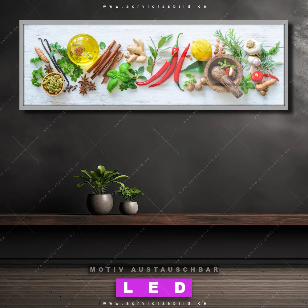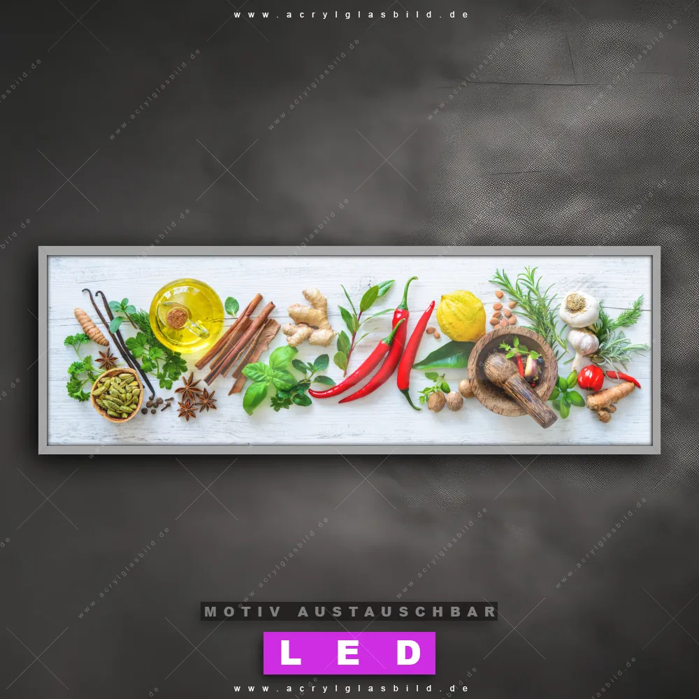 Deine Wände könnten dringend ein dimmbares LED Bild mit Fernbedienung und optionaler Farbtemperatursteuerung gebrauchen? Dann haben wir das perfekte Wandbild mit LED Beleuchtung für dich: unser mega-cooles Essen - Trinken Canvalight® DIA LED Acrylglasbild! Mit unserem angesagten Leuchtbild aus Acrylglas im Panorama-Format und der austauschbaren bedruckten Acrylglas-Scheibe Frische Kräuter & Gewürze bringst du nicht nur Licht, sondern auch jede Menge Flair in deine Räume.