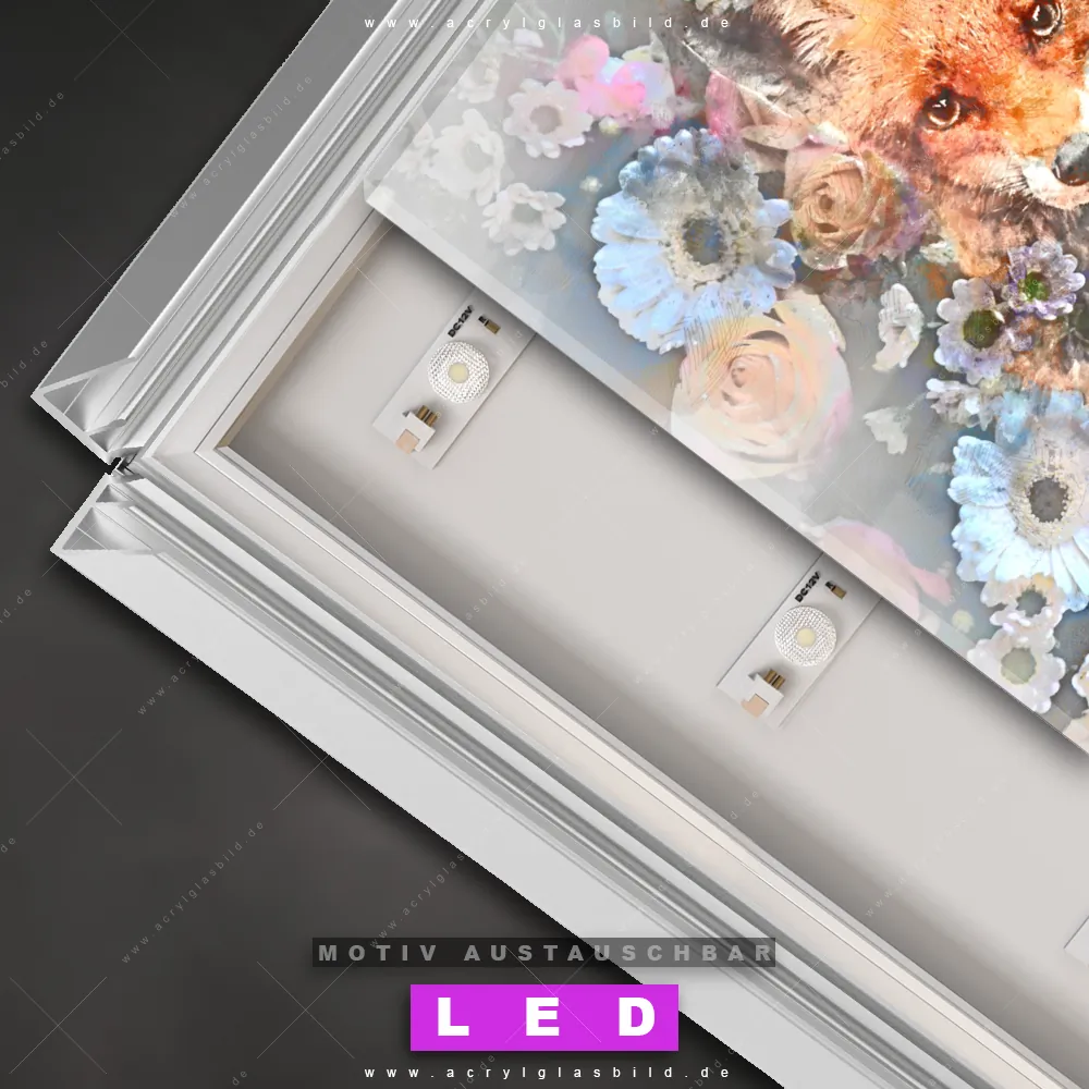 Also, worauf wartest du noch? Gib mit einem beleuchteten Wandbild mit wechselbarer Acrylglas-Scheibe deinen Wänden das gewisse Etwas und bestelle jetzt das LED Acrylglasbild Canvalight® DIA Aquarellgemälde eines Fuchses mit Blumen – dein Zuhause wird es dir danken und deine Freunde werden dank der wechselbaren Motive erblassen!