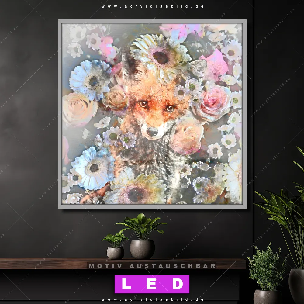 Bist du bereit, deine Wände mit einem dimmbaren LED Bild mit Fernbedienung und optionaler Farbtemperatursteuerung zum Leuchten zu bringen? Wir haben das ultimative Tierwelt, Blumen - Botanik LED Acrylglasbild Canvalight® DIA für dich! Unser LED Wandbild aus Acrylglas Fuchs & Blumen im Quadratischen Format mit austauschbarer bedruckter Acrylglas-Scheibe im DIA-Klapprahmen bringt sofort jede Menge Glanz in deine vier Wände.