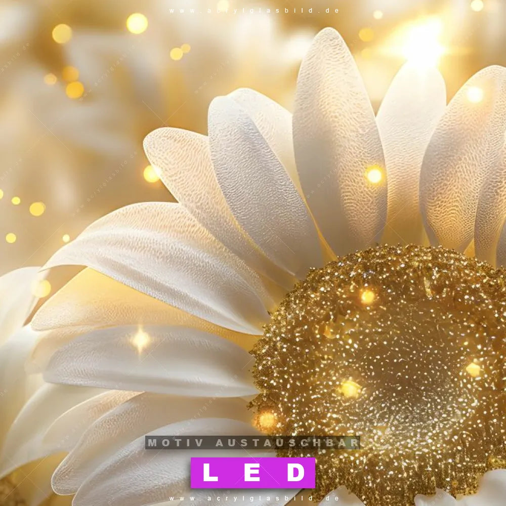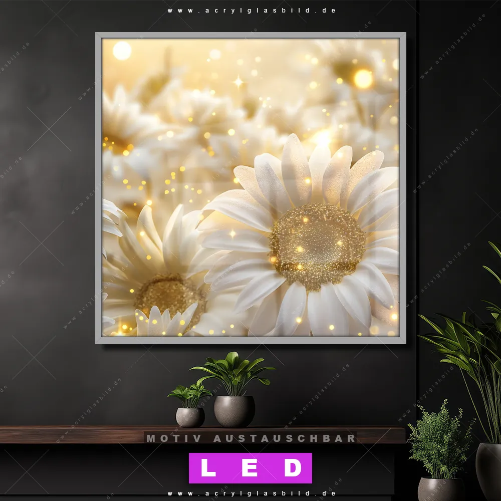 Vergiss dunkle Ecken und Langeweile! Mit unserem Acrylglasbild Glitzernde Gänseblümchen Kunst und seiner brillanten LED-Ausleuchtung wirst du dich nie wieder in der Dunkelheit verirren. Wenn du auf der Suche nach einem beleuchteten Wandbild aus Acrylglas mit Gänseblümchen, Blüten, Natur, Pflanze, Glitzer, Blütenmeer bist, ist unser LED Acrylglasbild Canvalight® DIA Leuchtende Blütenpracht mit den strahlenden Motiv-Farben Weiss, Gold genau das richtige Leuchtbild für dich. Das im Floral, Modern Art Stil gestaltete LED Bild mit glänzender Front aus Acrylglas passt perfekt zu jedem Einrichtungsstil in Wohnzimmer - Schlafzimmer, Arzt - Praxis, Flur - Eingangsbereich – vom minimalistischen Chic bis zum kreativen Chaos.