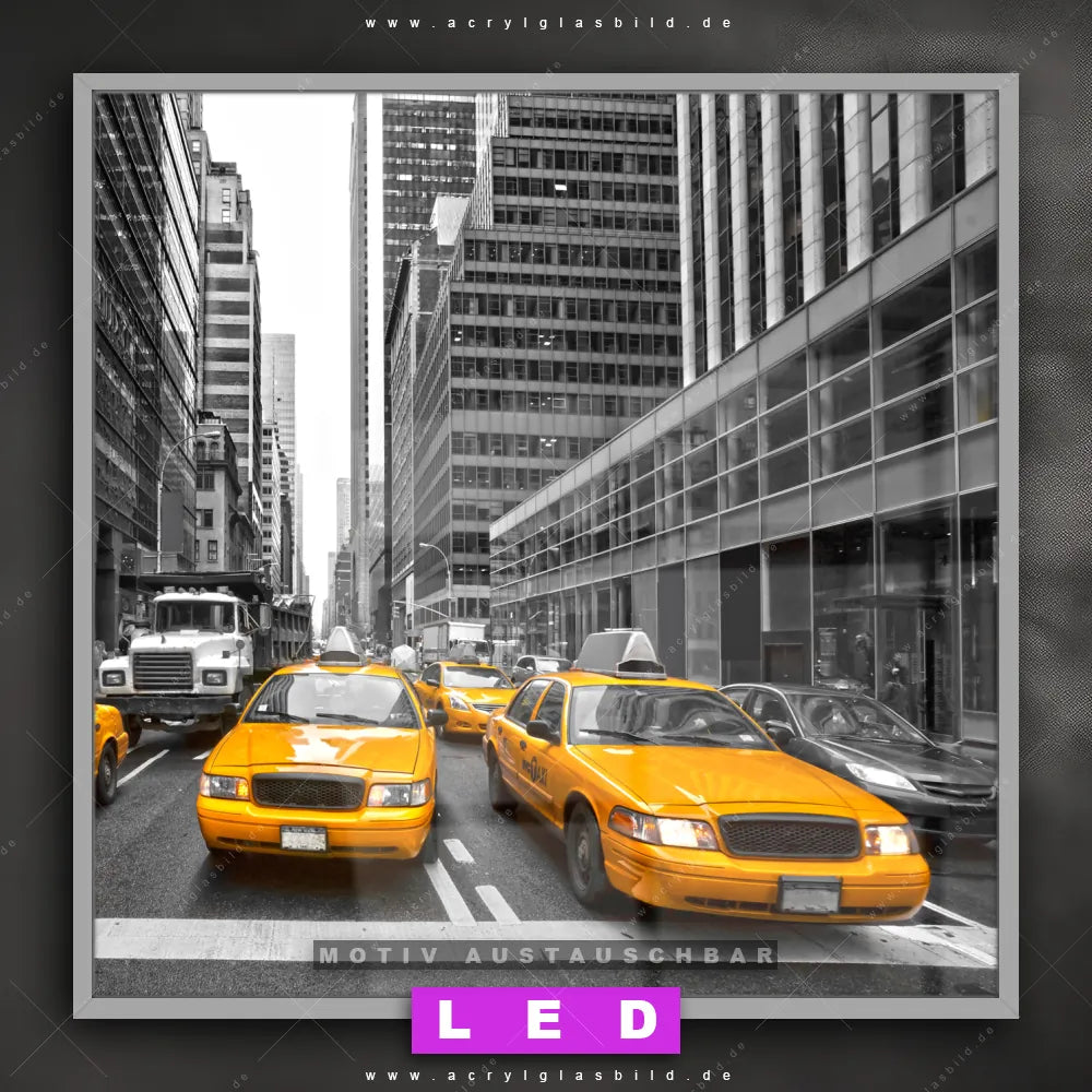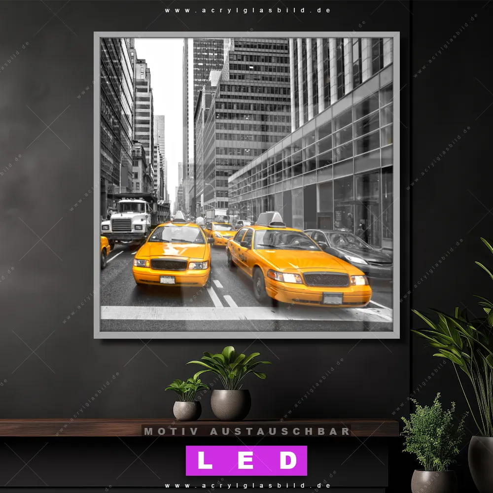 Bist du bereit, deine Wände mit einem dimmbaren LED Bild mit Fernbedienung und optionaler Farbtemperatursteuerung zum Leuchten zu bringen? Wir haben das ultimative Fahrzeuge, Städte - Skylines LED Acrylglasbild Canvalight® DIA für dich! Unser LED Wandbild aus Acrylglas Gelbe Taxis New York im Quadratischen Format mit austauschbarer bedruckter Acrylglas-Scheibe im DIA-Klapprahmen bringt sofort jede Menge Glanz in deine vier Wände.