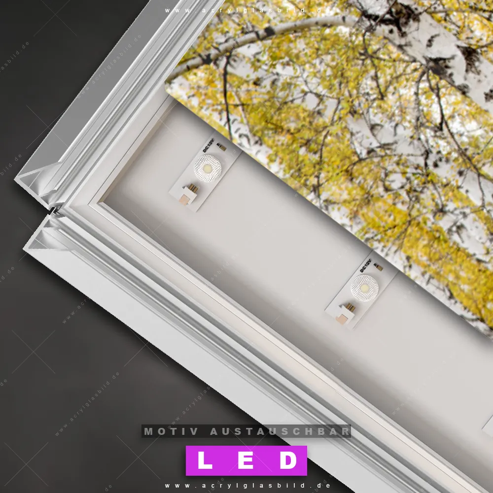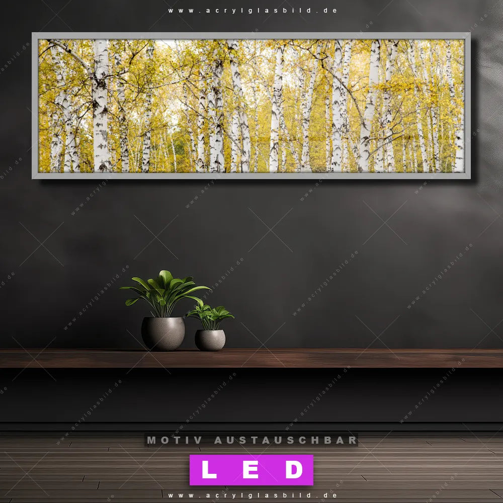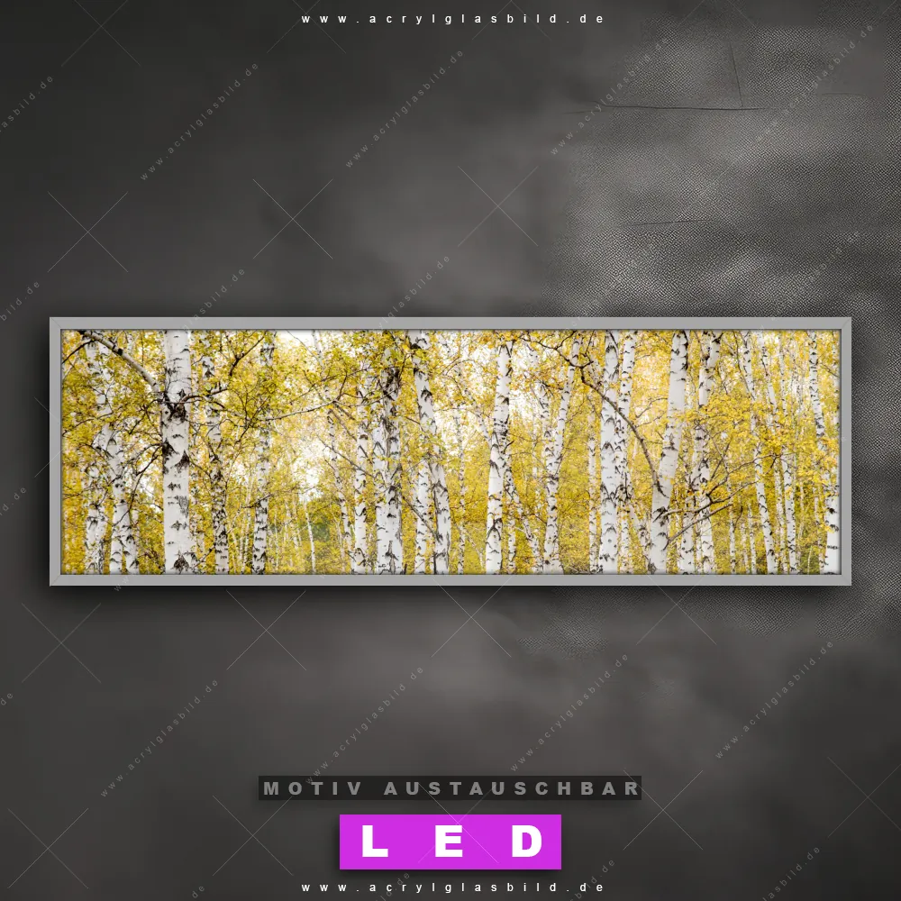 Deine Wände könnten dringend ein dimmbares LED Bild mit Fernbedienung und optionaler Farbtemperatursteuerung gebrauchen? Dann haben wir das perfekte Wandbild mit LED Beleuchtung für dich: unser mega-cooles Landschaften, Wald - Bäume Canvalight® DIA LED Acrylglasbild! Mit unserem angesagten Leuchtbild aus Acrylglas im Panorama-Format und der austauschbaren bedruckten Acrylglas-Scheibe Gelber Birkenwald bringst du nicht nur Licht, sondern auch jede Menge Flair in deine Räume.