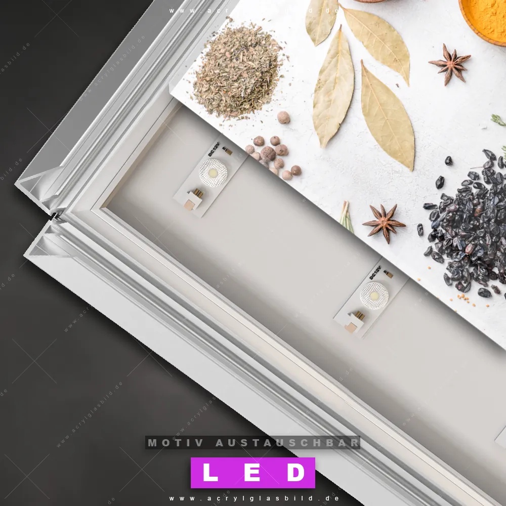 Also, worauf wartest du noch? Gib mit einem beleuchteten Wandbild mit wechselbarer Acrylglas-Scheibe deinen Wänden das gewisse Etwas und bestelle jetzt das LED Acrylglasbild Canvalight® DIA Verschiedene gesunde Gewürze – dein Zuhause wird es dir danken und deine Freunde werden dank der wechselbaren Motive erblassen!