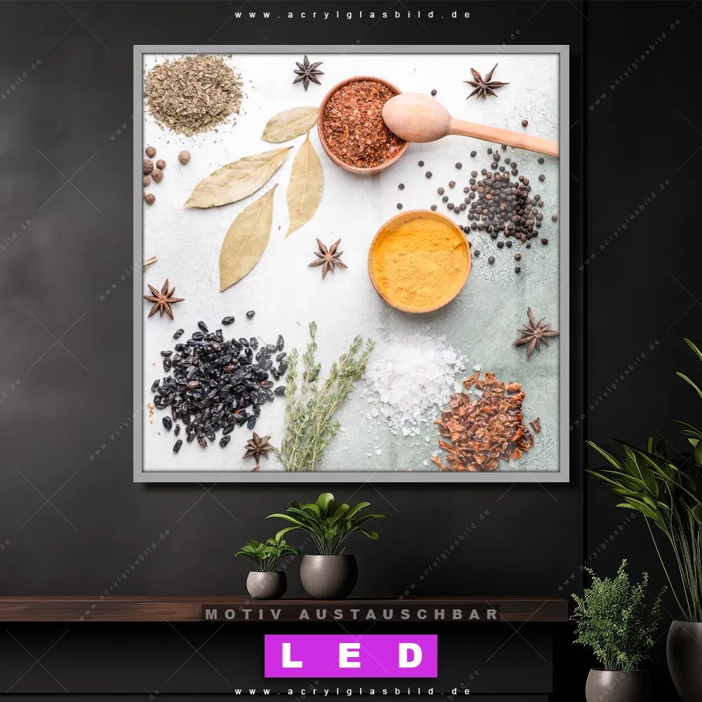Bist du bereit, deine Wände mit einem dimmbaren LED Bild mit Fernbedienung und optionaler Farbtemperatursteuerung zum Leuchten zu bringen? Wir haben das ultimative Essen - Trinken LED Acrylglasbild Canvalight® DIA für dich! Unser LED Wandbild aus Acrylglas Gewürze auf hellem Untergrund im Quadratischen Format mit austauschbarer bedruckter Acrylglas-Scheibe im DIA-Klapprahmen bringt sofort jede Menge Glanz in deine vier Wände.