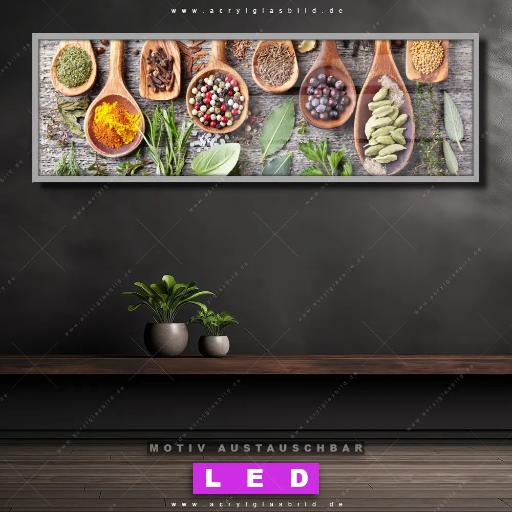 Deine Wände könnten dringend ein dimmbares LED Bild mit Fernbedienung und optionaler Farbtemperatursteuerung gebrauchen? Dann haben wir das perfekte Wandbild mit LED Beleuchtung für dich: unser mega-cooles Essen - Trinken Canvalight® DIA LED Acrylglasbild! Mit unserem angesagten Leuchtbild aus Acrylglas im Panorama-Format und der austauschbaren bedruckten Acrylglas-Scheibe Gewürze auf Holzlöffeln bringst du nicht nur Licht, sondern auch jede Menge Flair in deine Räume.