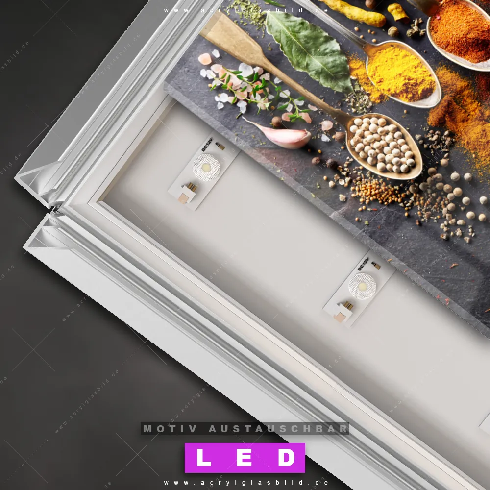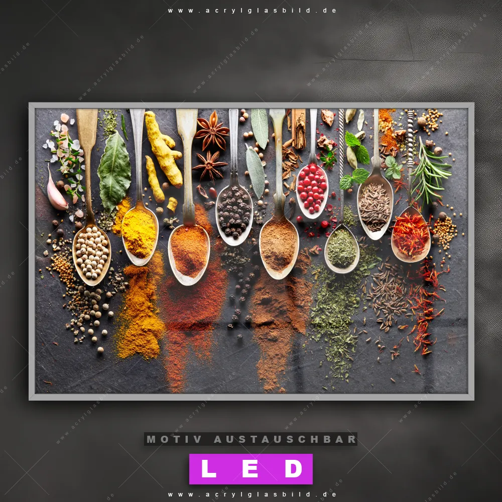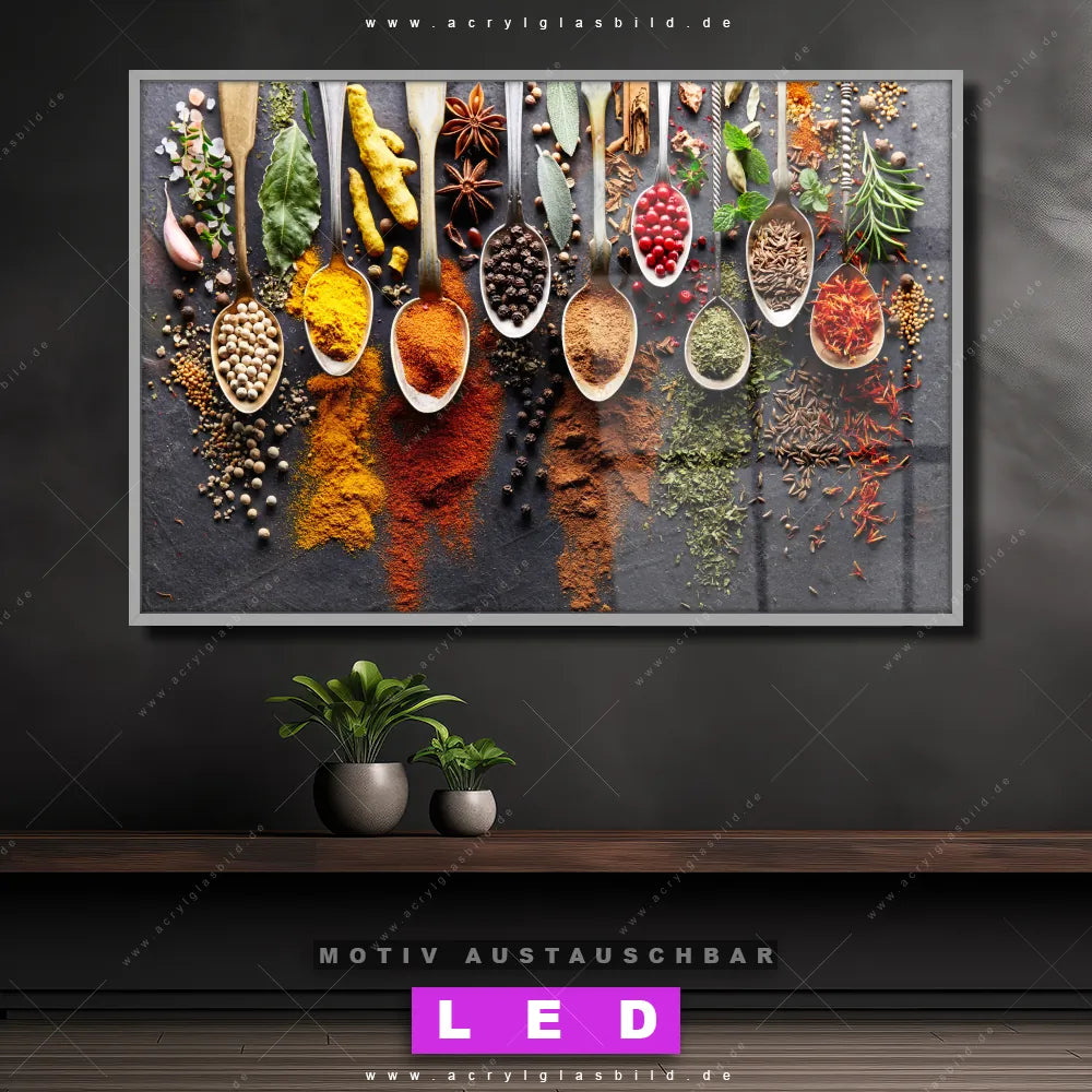 Du bist auf der Suche nach einem dimmbaren Essen - Trinken LED Bild mit Fernbedienung und optionaler Farbtemperatursteuerung? Dann haben wir hier genau das richtige Wandbild mit LED Beleuchtung für dich: Unser Canvalight® DIA LED Acrylglasbild Gewürze auf Löffeln No. 2 im Querformat mit austauschbarer bedruckter Acrylglas-Scheibe. Dieses Leuchtbild bringt sofort Partybeleuchtung in deine Räume!