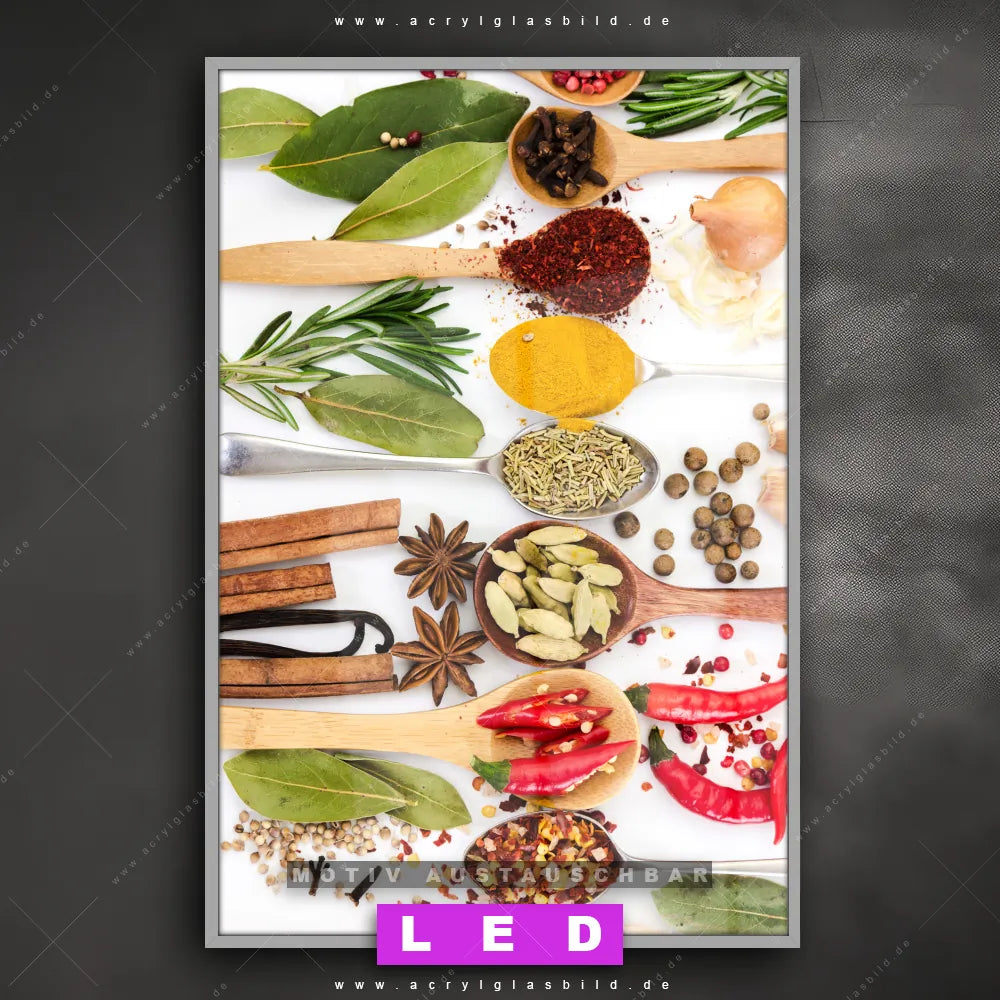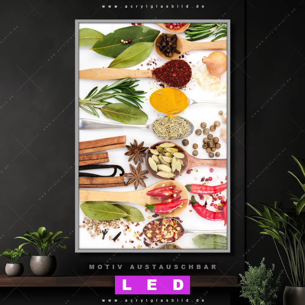 Du suchst nach einem Wandbild mit LED Beleuchtung als ultimativen Hingucker für deine Wände? Dann haben wir das perfekte dimmbare LED Bild mit Fernbedienung und optionaler Farbtemperatursteuerung für dich: unser abgefahrenes Essen - Trinken Canvalight® DIA LED Acrylglasbild! Mit dem LED Leuchtbild aus Acrylglas Gewürze auf Löffeln - weiß im Hochformat mit austauschbarer bedruckter Acrylglas-Scheibe bringst du nicht nur Licht, sondern auch ordentlich Stil in deine Bude.