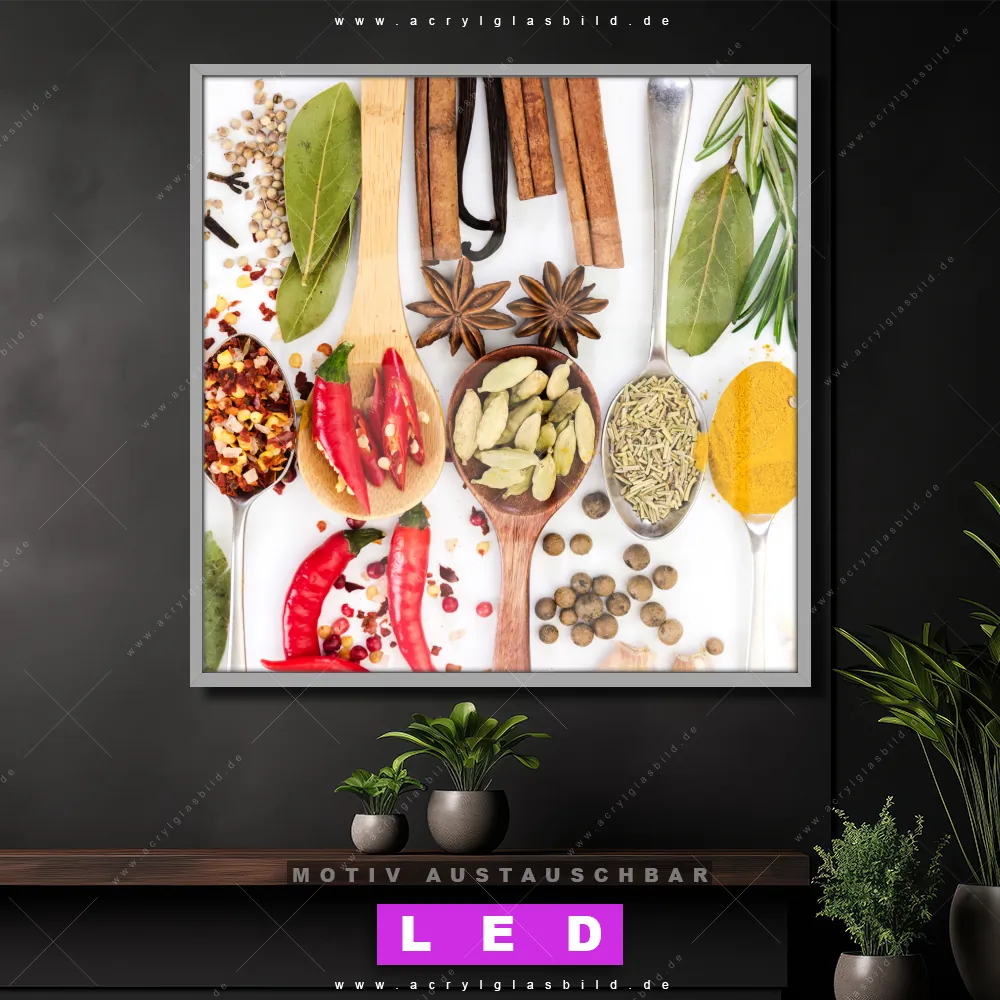 Begriffe wie Gewürze, Kräuter, Löffel, kochen, Pfeffer, Salz, Curry, Chili haben dich auf der Suche nach deinem neuen LED Wandbild aus Acrylglas inspiriert? Dann sollte das LED Acrylglasbild bunte Gewürz- und Kräutermischung den Weg zu dir finden.