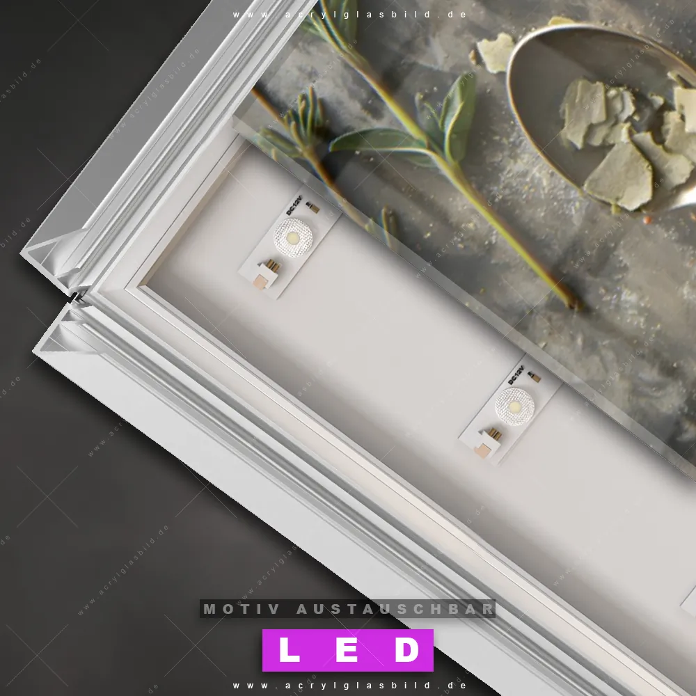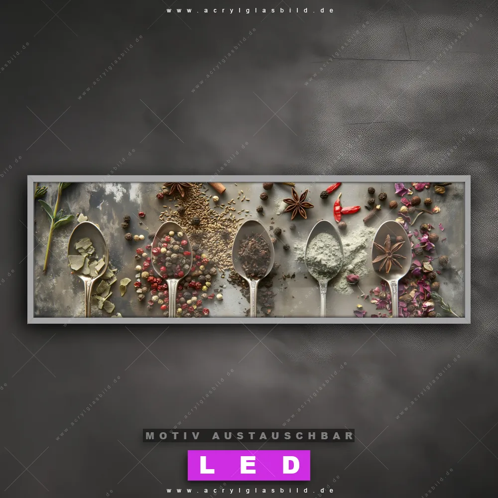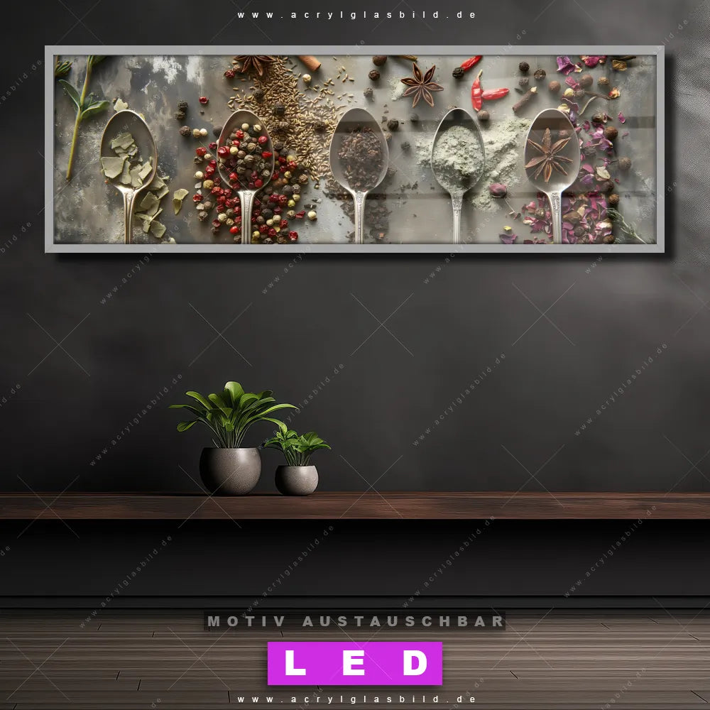 Wer will schon dunkle, triste Wände? Mit unserem LED Acrylglasbild Canvalight® DIA Kulinarische Vielfalt und seiner fantastischen LED-Ausleuchtung werden deine Wände in Küche - Esszimmer, Bar - Gastronomie zu echten Hinguckern. Wenn du auf der Suche nach einem beleuchteten Wandbild aus Acrylglas mit Löffel, Besteck, Kräuter, Gewürze, kochen, Zutaten, Lebensmittel, Geschmack, Aromen, Pfeffer bist, dann solltest du unser LED Leuchhtbild Küchengeheimnisse mit den beeindruckenden Motiv-Farben Silber, Grau , Braun nicht verpassen. Gestaltet im angesagten Natürlich - Realistisch Stil, passt das LED Bild mit DIA-Klapprahmen und wechselbarer Acrylglas-Scheibe perfekt zu jedem Einrichtungsstil – selbst in deinem kleinen Dschungel aus Kreativität und Chaos!