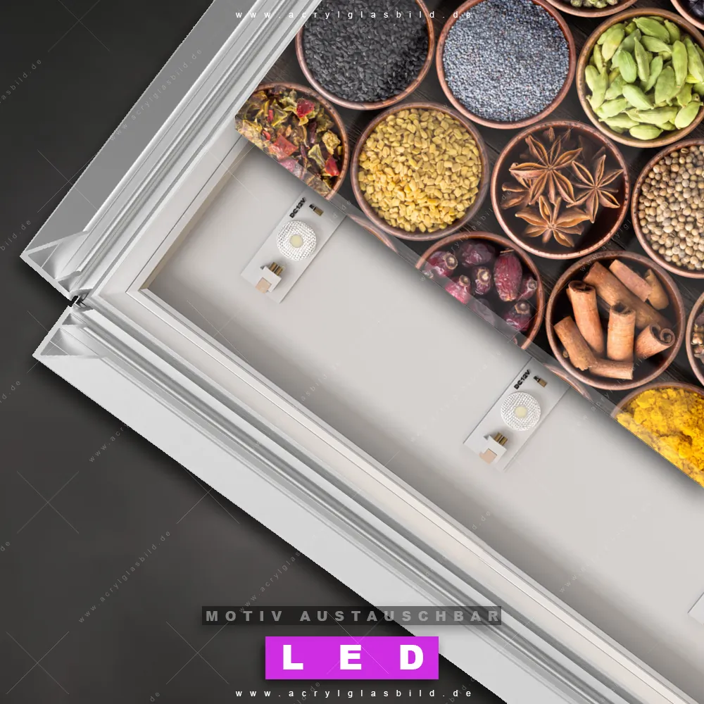 Also, worauf wartest du noch? Gib mit einem beleuchteten Wandbild mit wechselbarer Acrylglas-Scheibe deinen Wänden das gewisse Etwas und bestelle jetzt das LED Acrylglasbild Canvalight® DIA Schälchen mit bunten Kräutern & Gewürzen – dein Zuhause wird es dir danken und deine Freunde werden dank der wechselbaren Motive erblassen!