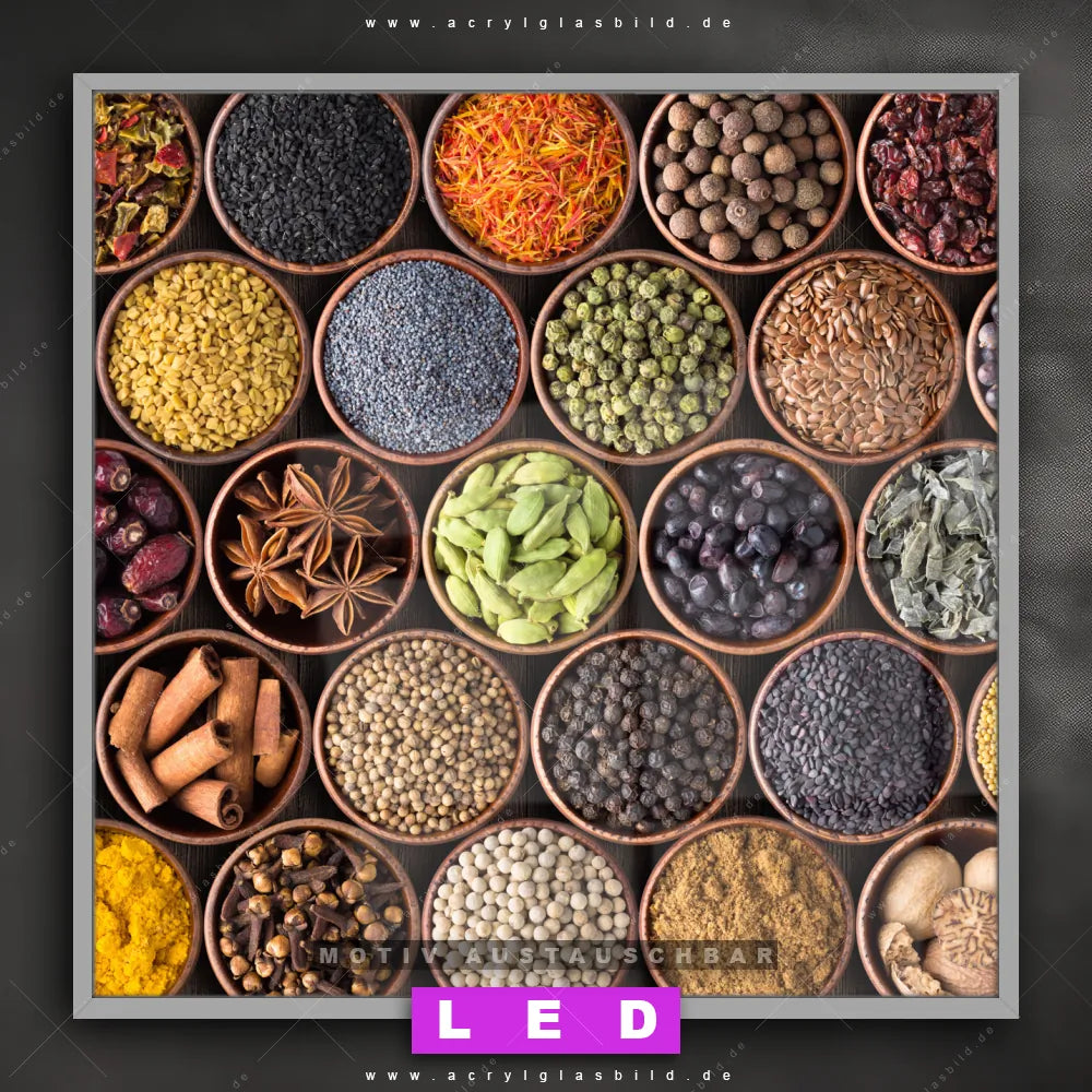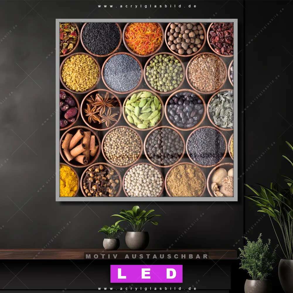 Bist du bereit, deine Wände mit einem dimmbaren LED Bild mit Fernbedienung und optionaler Farbtemperatursteuerung zum Leuchten zu bringen? Wir haben das ultimative Essen - Trinken LED Acrylglasbild Canvalight® DIA für dich! Unser LED Wandbild aus Acrylglas Gewürze & Kräuter im Quadratischen Format mit austauschbarer bedruckter Acrylglas-Scheibe im DIA-Klapprahmen bringt sofort jede Menge Glanz in deine vier Wände.