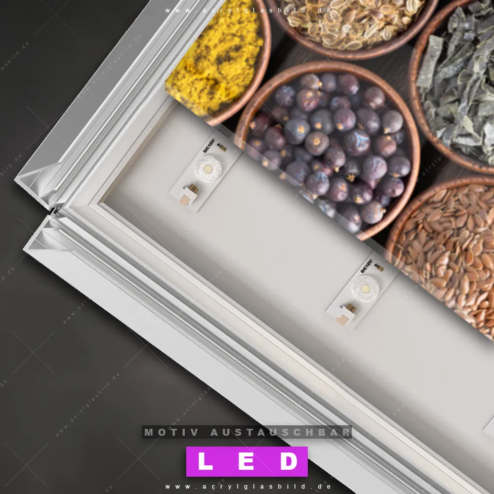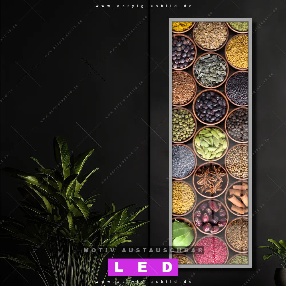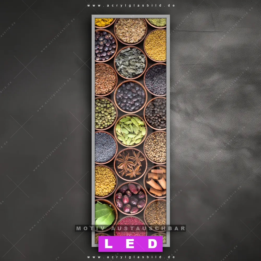 Bist du bereit, deine Wände mit einem dimmbaren LED Bild mit Fernbedienung und optionaler Farbtemperatursteuerung auf das nächste Level zu bringen? Unser Essen - Trinken Canvalight® DIA LED Acrylglasbild ist genau das, was du brauchst! Das Wandbild mit LED Beleuchtung im Schmalen Format mit austauschbarer bedruckter Acrylglas-Scheibe Gewürze & Kräuter bringt Licht und Stil in dein Zuhause – und das in null Komma nichts!