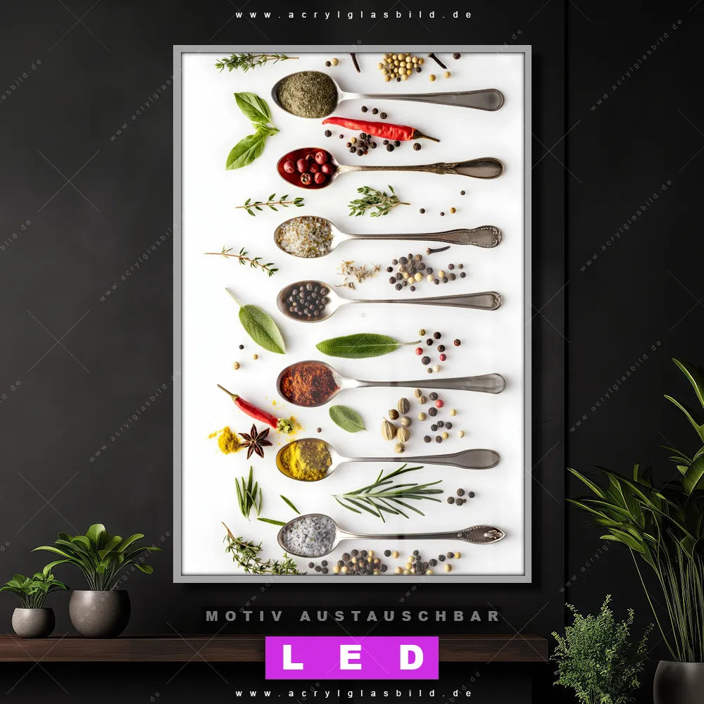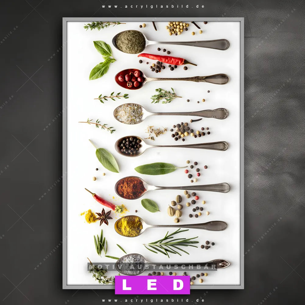 Begriffe wie Gewürze, Kräuter, Löffel, Besteck, Lebensmittel, Geschmack, kochen, Aromen haben dich auf der Suche nach deinem neuen LED Wandbild aus Acrylglas inspiriert? Dann sollte das LED Acrylglasbild Küchenkunst: Gewürze den Weg zu dir finden.