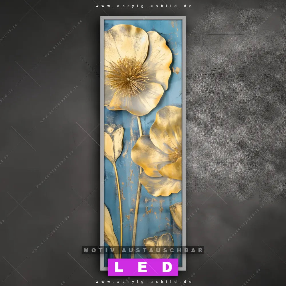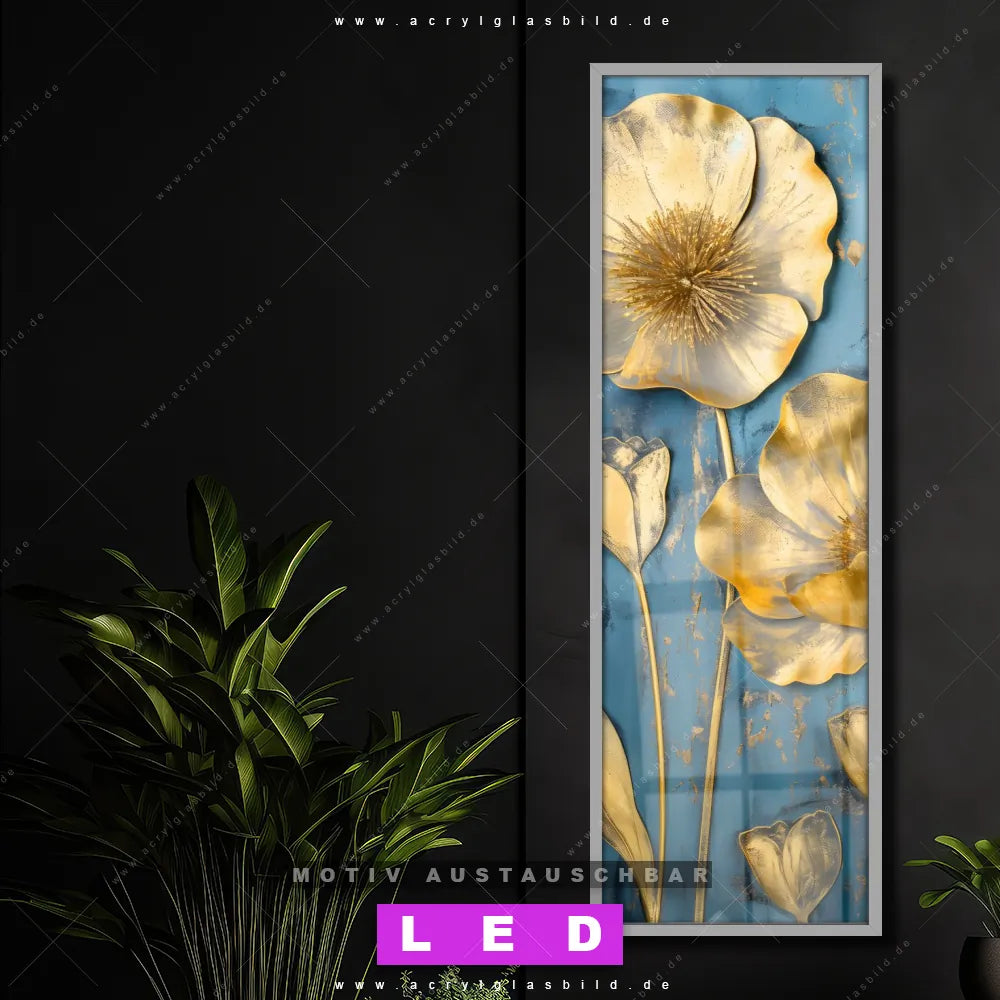 Bist du bereit, deine Wände mit einem dimmbaren LED Bild mit Fernbedienung und optionaler Farbtemperatursteuerung auf das nächste Level zu bringen? Unser Blumen - Botanik Canvalight® DIA LED Acrylglasbild ist genau das, was du brauchst! Das Wandbild mit LED Beleuchtung im Schmalen Format mit austauschbarer bedruckter Acrylglas-Scheibe Goldene Blumen auf Blau bringt Licht und Stil in dein Zuhause – und das in null Komma nichts!