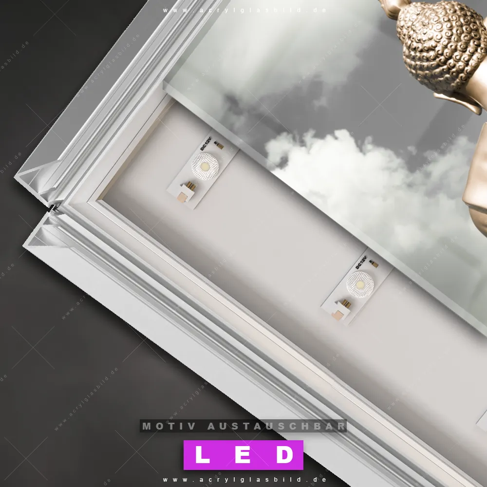 Bist du bereit, deine Wände mit einem dimmbaren LED Bild mit Fernbedienung und optionaler Farbtemperatursteuerung zum Leuchten zu bringen? Wir haben das ultimative Buddha - Feng Shui LED Acrylglasbild Canvalight® DIA für dich! Unser LED Wandbild aus Acrylglas Goldene Buddha Statue im Quadratischen Format mit austauschbarer bedruckter Acrylglas-Scheibe im DIA-Klapprahmen bringt sofort jede Menge Glanz in deine vier Wände.