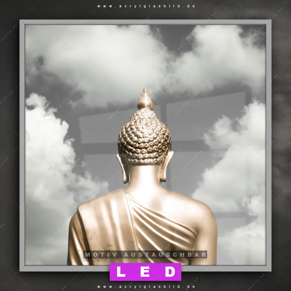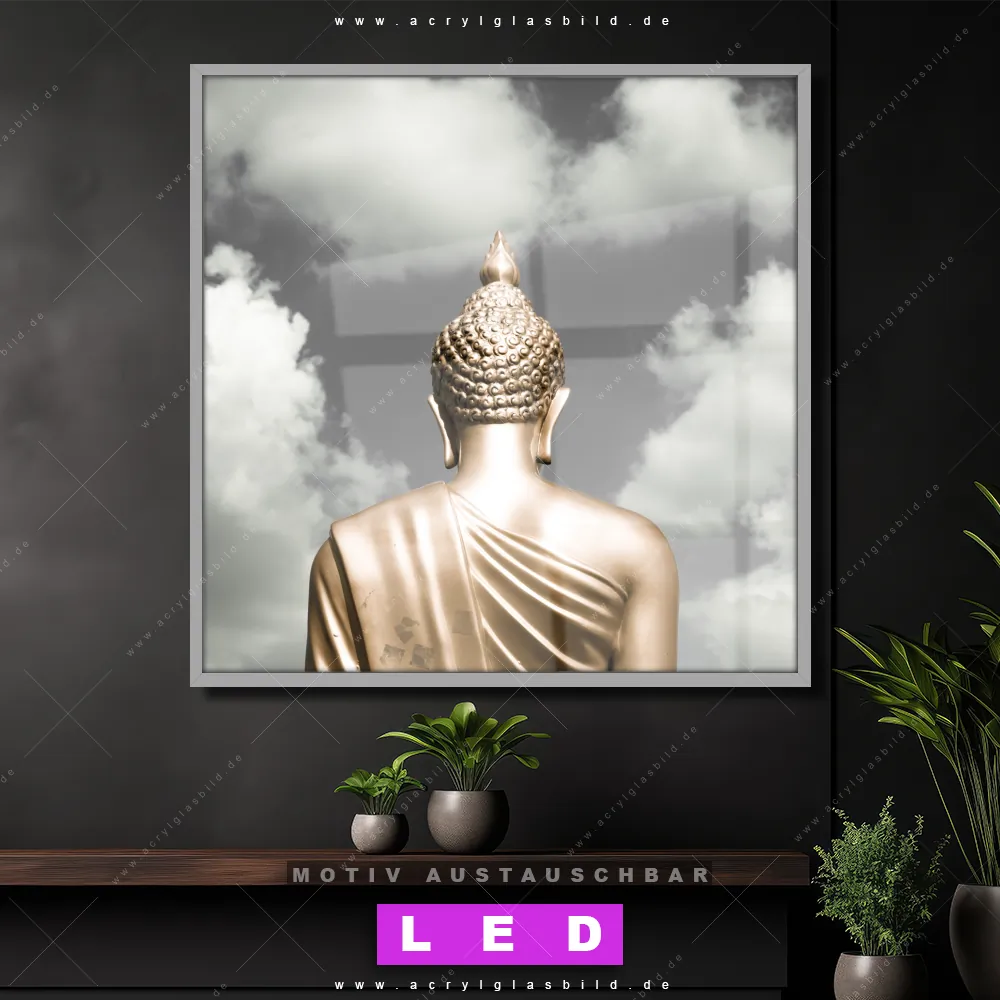 Vergiss dunkle Ecken und Langeweile! Mit unserem Acrylglasbild Buddha Rückansicht in Gold und seiner brillanten LED-Ausleuchtung wirst du dich nie wieder in der Dunkelheit verirren. Wenn du auf der Suche nach einem beleuchteten Wandbild aus Acrylglas mit Buddha, Buddhismus, Religion, Feng Shui, Zen, Meditation, spirituell, heilig, Esoterik, Gott, Gesicht, Statue bist, ist unser LED Acrylglasbild Canvalight® DIA Buddha vor wolkigem Himmel mit den strahlenden Motiv-Farben Weiss, Beige, Gold genau das richtige Leuchtbild für dich. Das im Mixed Media, Modern Art Stil gestaltete LED Bild mit glänzender Front aus Acrylglas passt perfekt zu jedem Einrichtungsstil in Arzt - Praxis, Wohnzimmer - Schlafzimmer, Büro - Kanzlei, Flur - Eingangsbereich, Friseur - Beauty – vom minimalistischen Chic bis zum kreativen Chaos.