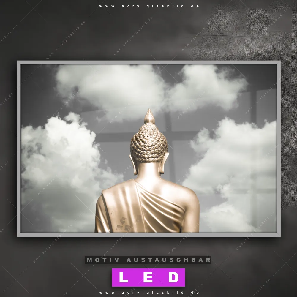 Du bist auf der Suche nach einem dimmbaren Buddha - Feng Shui LED Bild mit Fernbedienung und optionaler Farbtemperatursteuerung? Dann haben wir hier genau das richtige Wandbild mit LED Beleuchtung für dich: Unser Canvalight® DIA LED Acrylglasbild Goldene Buddha Statue im Querformat mit austauschbarer bedruckter Acrylglas-Scheibe. Dieses Leuchtbild bringt sofort Partybeleuchtung in deine Räume!