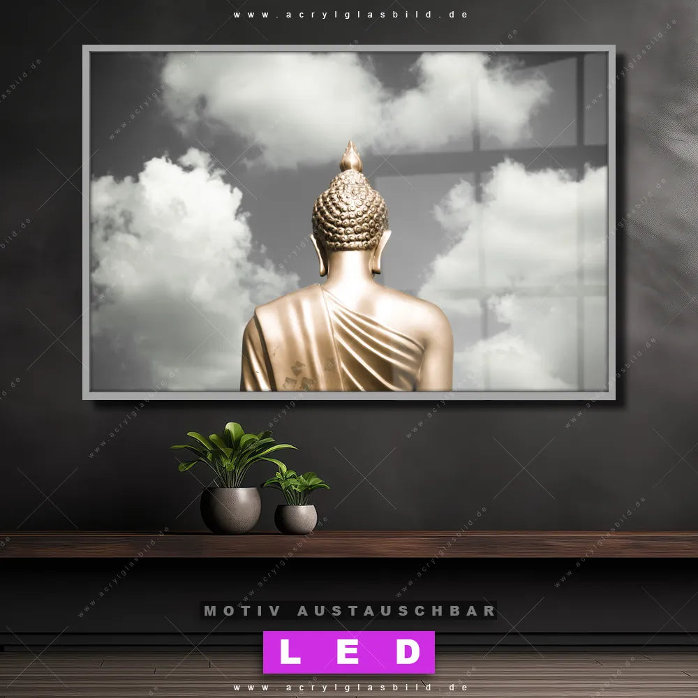 Mit unserem LED Acrylglasbild Canvalight® DIA Buddha Rückansicht in Gold und seiner genialen LED-Ausleuchtung wirst du nie wieder im Dunkeln auf deinem Sofa herumtappen. Wenn du nach einem beleuchteten Wandbild aus Acrylglas mit Buddha, Buddhismus, Religion, Feng Shui, Zen, Meditation, spirituell, heilig, Esoterik, Gott, Gesicht, Statue für Arzt - Praxis, Wohnzimmer - Schlafzimmer, Büro - Kanzlei, Flur - Eingangsbereich, Friseur - Beauty suchst, ist unser LED Leuchtbild Buddha vor wolkigem Himmel in den beeindruckenden Motiv-Farben Weiss, Beige, Gold genau das richtige beleuchtete Wandbild für dich. Gestaltet im Mixed Media, Modern Art Stil, passt dieses LED Wandbild mit DIA-Klapprahmen und glänzender Front aus Acrylglas perfekt zu jedem Einrichtungsstil – sogar zu deinem chaotischen kreativen Durcheinander!