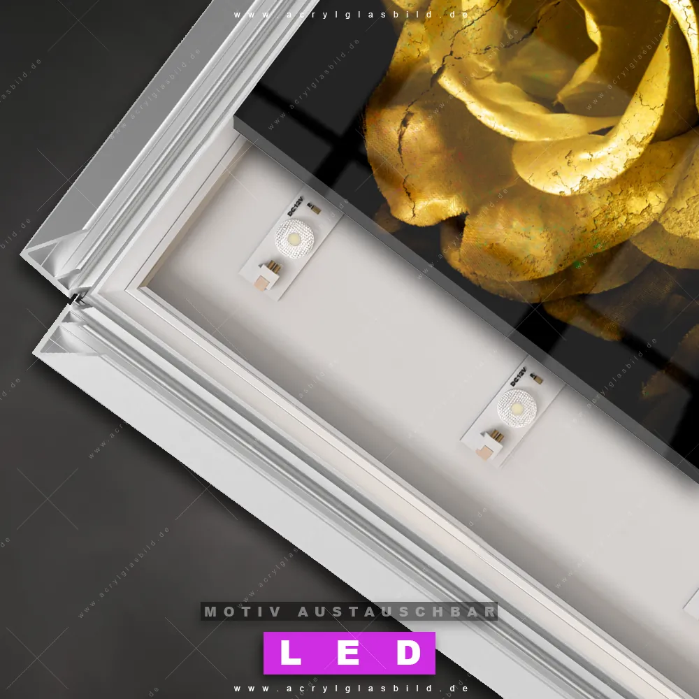 Also, worauf wartest du noch? Gib mit einem beleuchteten Wandbild mit wechselbarer Acrylglas-Scheibe deinen Wänden das gewisse Etwas und bestelle jetzt das LED Acrylglasbild Canvalight® DIA Rose in gold mit schwarzem Hintergrund – dein Zuhause wird es dir danken und deine Freunde werden dank der wechselbaren Motive erblassen!