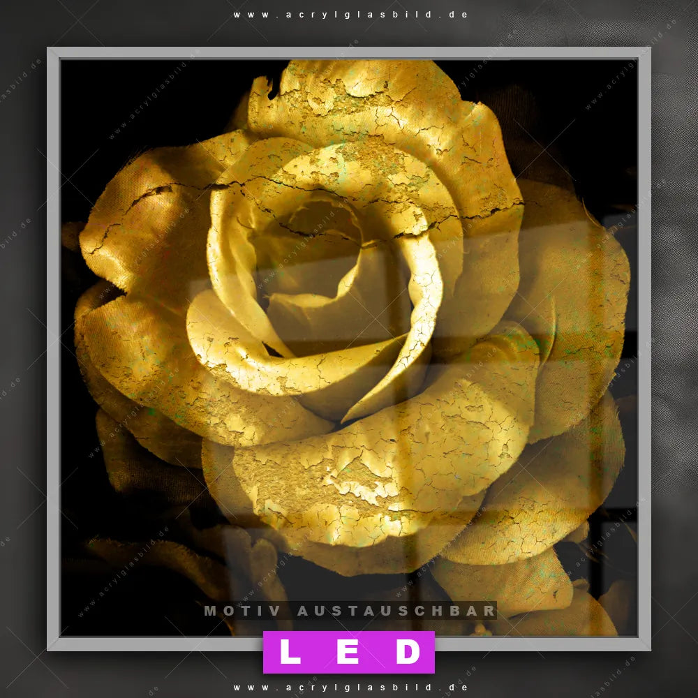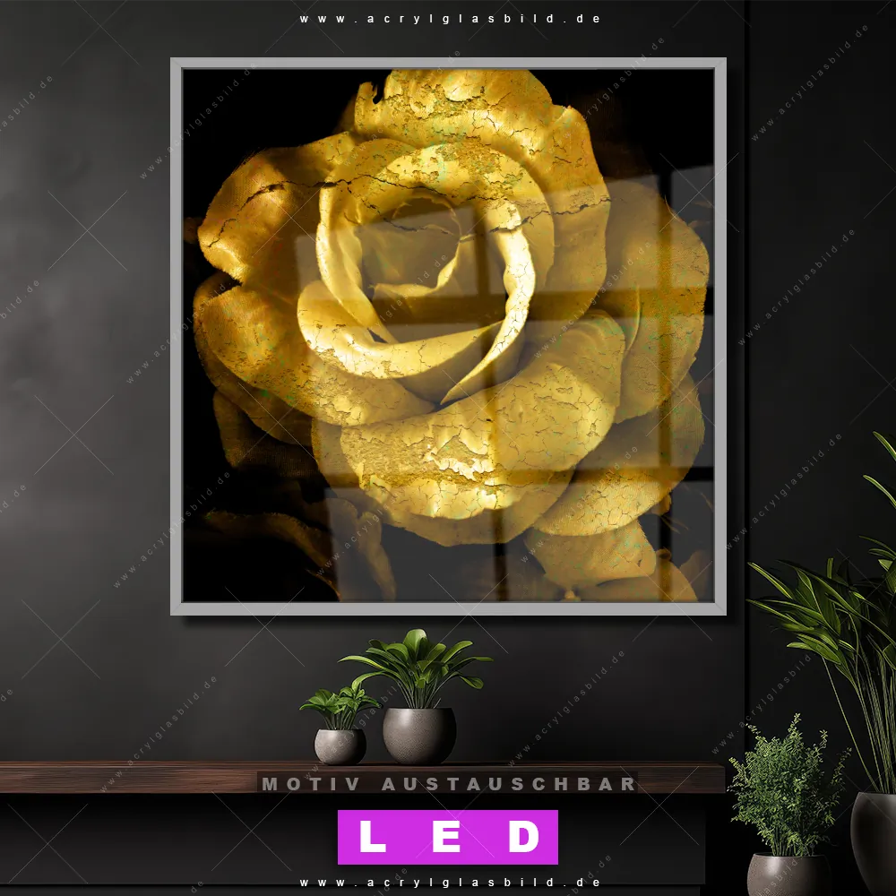 Vergiss dunkle Ecken und Langeweile! Mit unserem Acrylglasbild Rosenblüte mit goldener Farbe und seiner brillanten LED-Ausleuchtung wirst du dich nie wieder in der Dunkelheit verirren. Wenn du auf der Suche nach einem beleuchteten Wandbild aus Acrylglas mit Blumen | Botanik, Pflanze, Natur, Blüte, Nahaufnahme, Draufsicht, vintage, Rose, Gold bist, ist unser LED Acrylglasbild Canvalight® DIA goldene Blüte mit den strahlenden Motiv-Farben Gold, Schwarz genau das richtige Leuchtbild für dich. Das im Minimalistisch Stil gestaltete LED Bild mit glänzender Front aus Acrylglas passt perfekt zu jedem Einrichtungsstil in Wohnzimmer - Schlafzimmer, Friseur - Beauty, Flur - Eingangsbereich, Büro - Kanzlei, Arzt - Praxis – vom minimalistischen Chic bis zum kreativen Chaos.