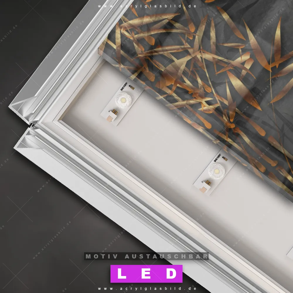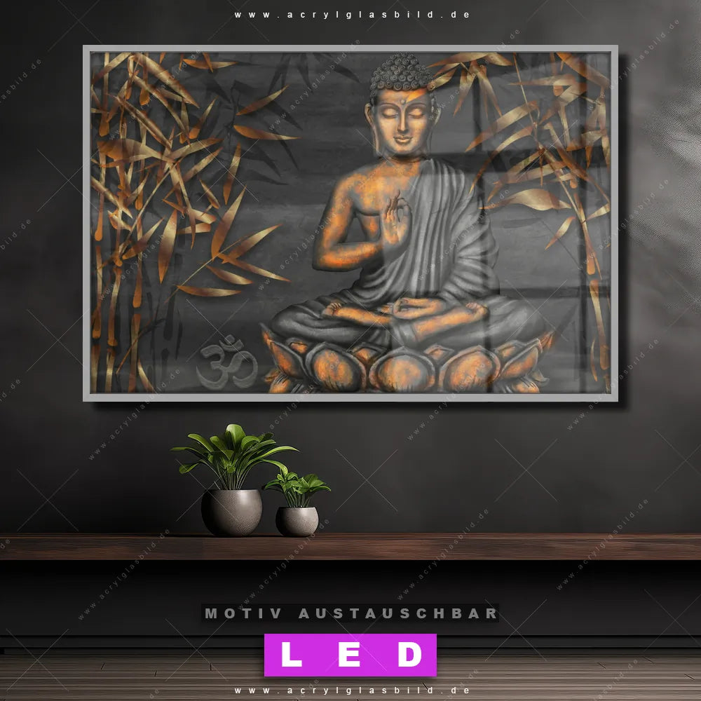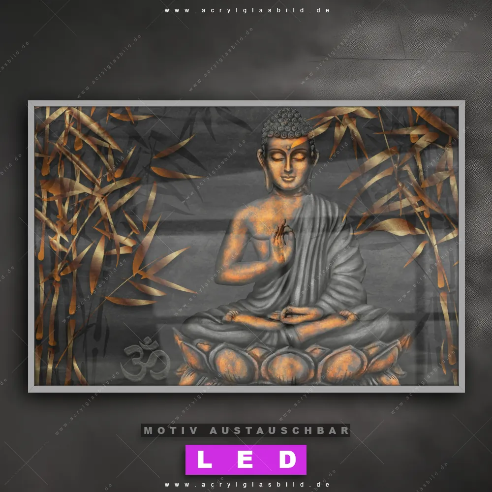 Du bist auf der Suche nach einem dimmbaren Buddha - Feng Shui LED Bild mit Fernbedienung und optionaler Farbtemperatursteuerung? Dann haben wir hier genau das richtige Wandbild mit LED Beleuchtung für dich: Unser Canvalight® DIA LED Acrylglasbild Goldener Buddha & Bambus im Querformat mit austauschbarer bedruckter Acrylglas-Scheibe. Dieses Leuchtbild bringt sofort Partybeleuchtung in deine Räume!