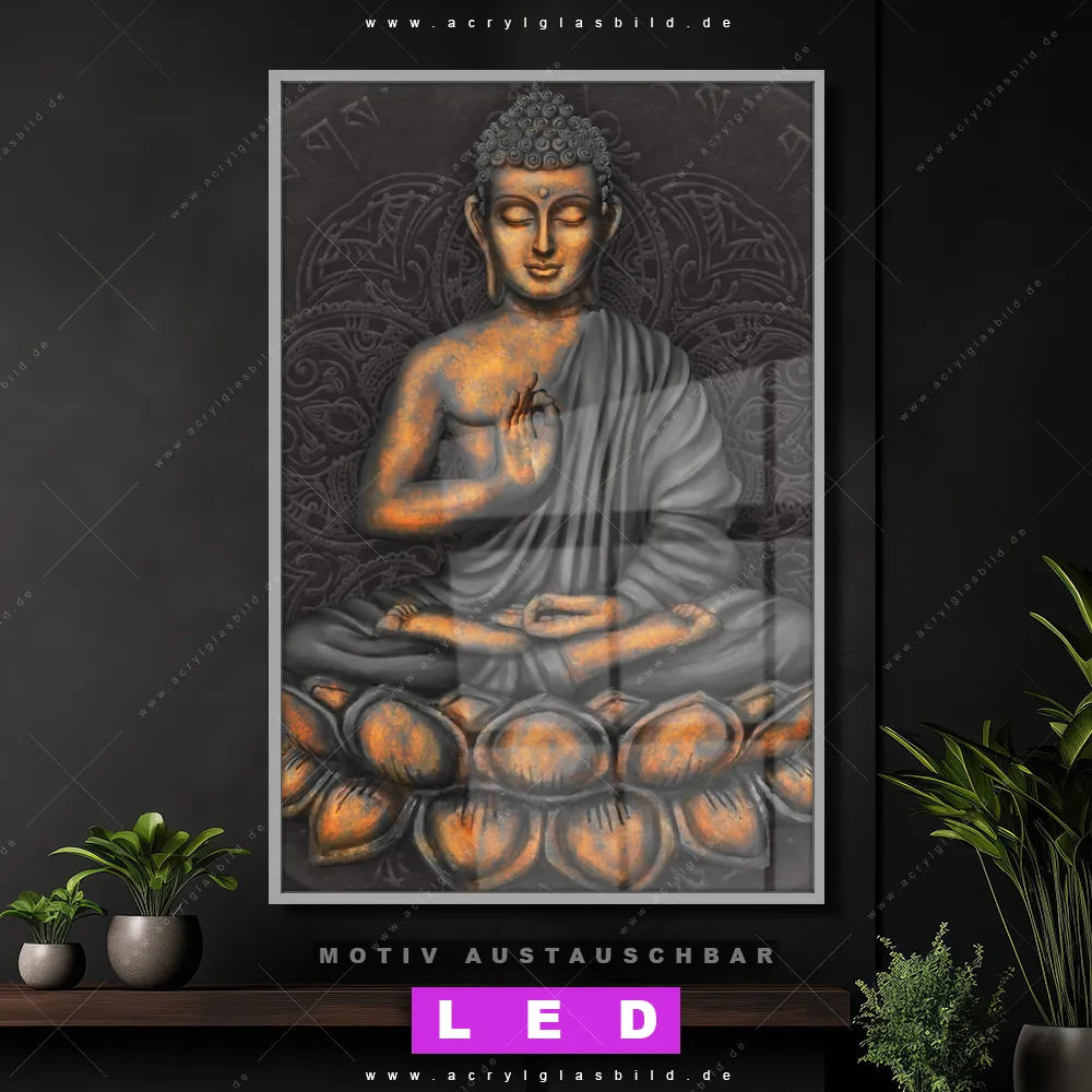Du suchst nach einem Wandbild mit LED Beleuchtung als ultimativen Hingucker für deine Wände? Dann haben wir das perfekte dimmbare LED Bild mit Fernbedienung und optionaler Farbtemperatursteuerung für dich: unser abgefahrenes Buddha - Feng Shui Canvalight® DIA LED Acrylglasbild! Mit dem LED Leuchtbild aus Acrylglas Goldener Buddha im Hochformat mit austauschbarer bedruckter Acrylglas-Scheibe bringst du nicht nur Licht, sondern auch ordentlich Stil in deine Bude.
