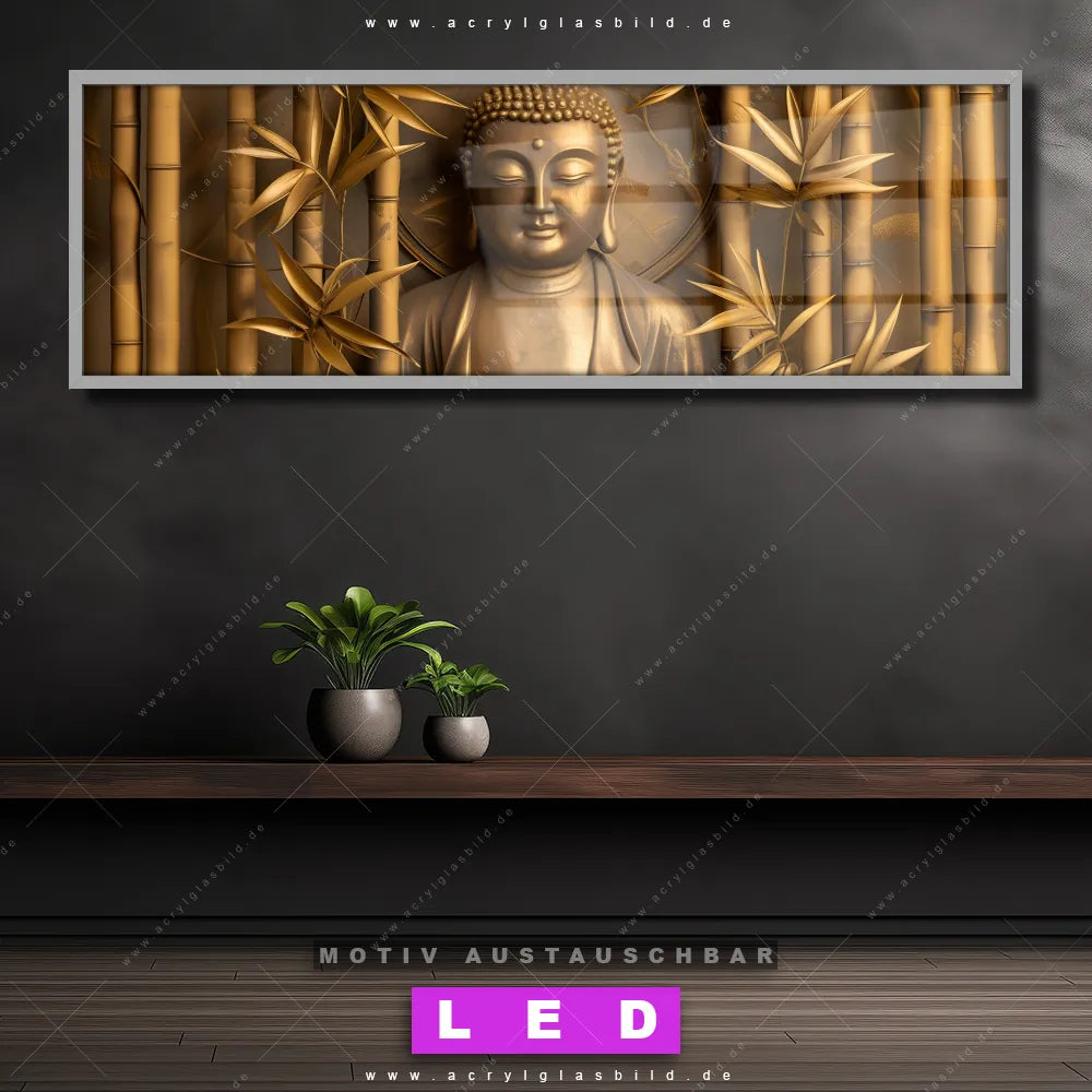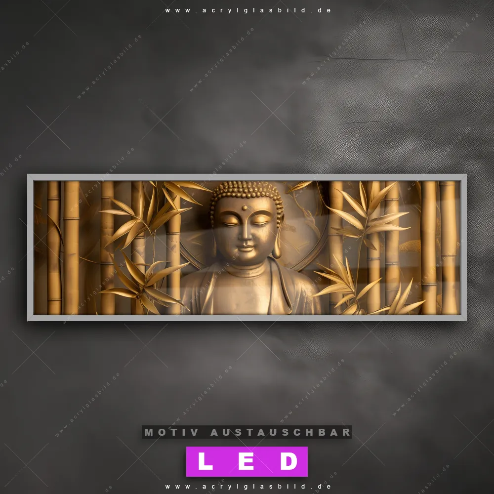 LED Acrylglasbild Canvalight® DIA | Goldener Buddha im Bambuswald | Panorama