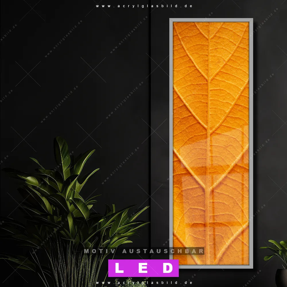 Vergiss dunkle Ecken und langweilige Wände in Arzt - Praxis, Büro - Kanzlei, Wohnzimmer - Schlafzimmer! Mit unserem LED Acrylglasbild Canvalight® DIA Laubblatt in gold wirst du nie wieder im Dunkeln tappen. Suchst du nach einem beleuchteten Wandbild mit Pflanze, Natur, Nahaufnahme, Vogelperspektive, Draufsicht, Blatt, Blätter? Dann ist unser Leuchtbild gold schimmernder Blatt-Teil mit den strahlenden Motiv-Farben Gold, Orange, Ocker genau das richtige LED Bild für dich. Egal, ob dein Stil minimalistisch oder exotisch ist, dieses LED Leuchtbild im Modern Art, Minimalistisch Stil mit DIA-Klapprahmen und glänzender Front aus Acrylglas passt perfekt zu jeder Einrichtung.
