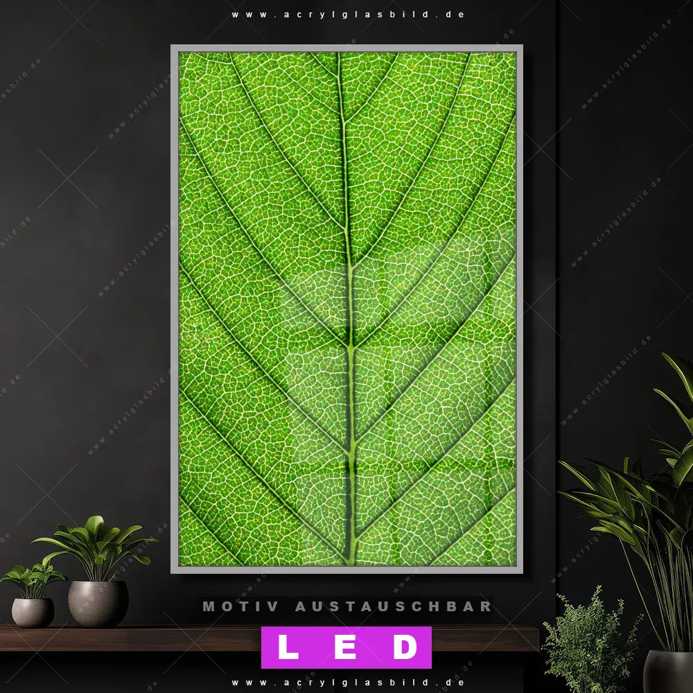 Du suchst nach einem Wandbild mit LED Beleuchtung als ultimativen Hingucker für deine Wände? Dann haben wir das perfekte dimmbare LED Bild mit Fernbedienung und optionaler Farbtemperatursteuerung für dich: unser abgefahrenes Blumen - Botanik, Wald - Bäume Canvalight® DIA LED Acrylglasbild! Mit dem LED Leuchtbild aus Acrylglas Grüne Blattadern im Hochformat mit austauschbarer bedruckter Acrylglas-Scheibe bringst du nicht nur Licht, sondern auch ordentlich Stil in deine Bude.
