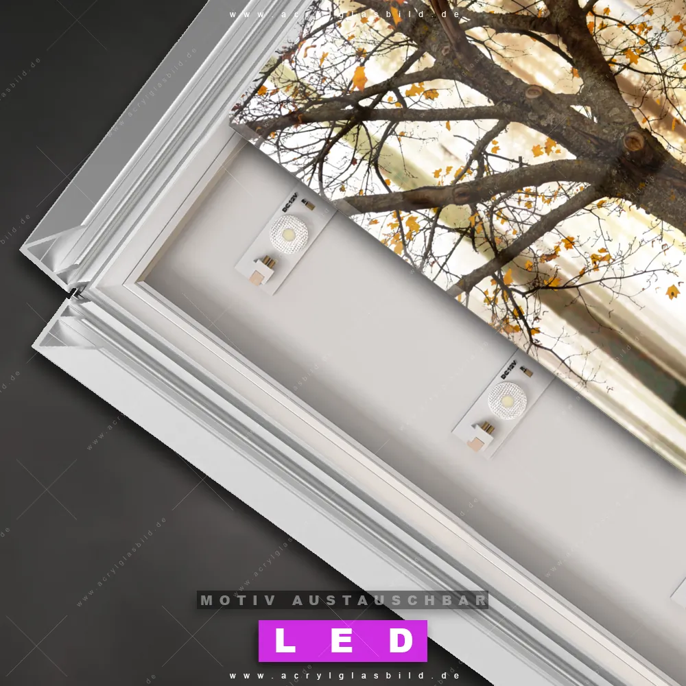 Also, worauf wartest du noch? Gib mit einem beleuchteten Wandbild mit wechselbarer Acrylglas-Scheibe deinen Wänden das gewisse Etwas und bestelle jetzt das LED Acrylglasbild Canvalight® DIA Morgenspaziergang im Herbst – dein Zuhause wird es dir danken und deine Freunde werden dank der wechselbaren Motive erblassen!