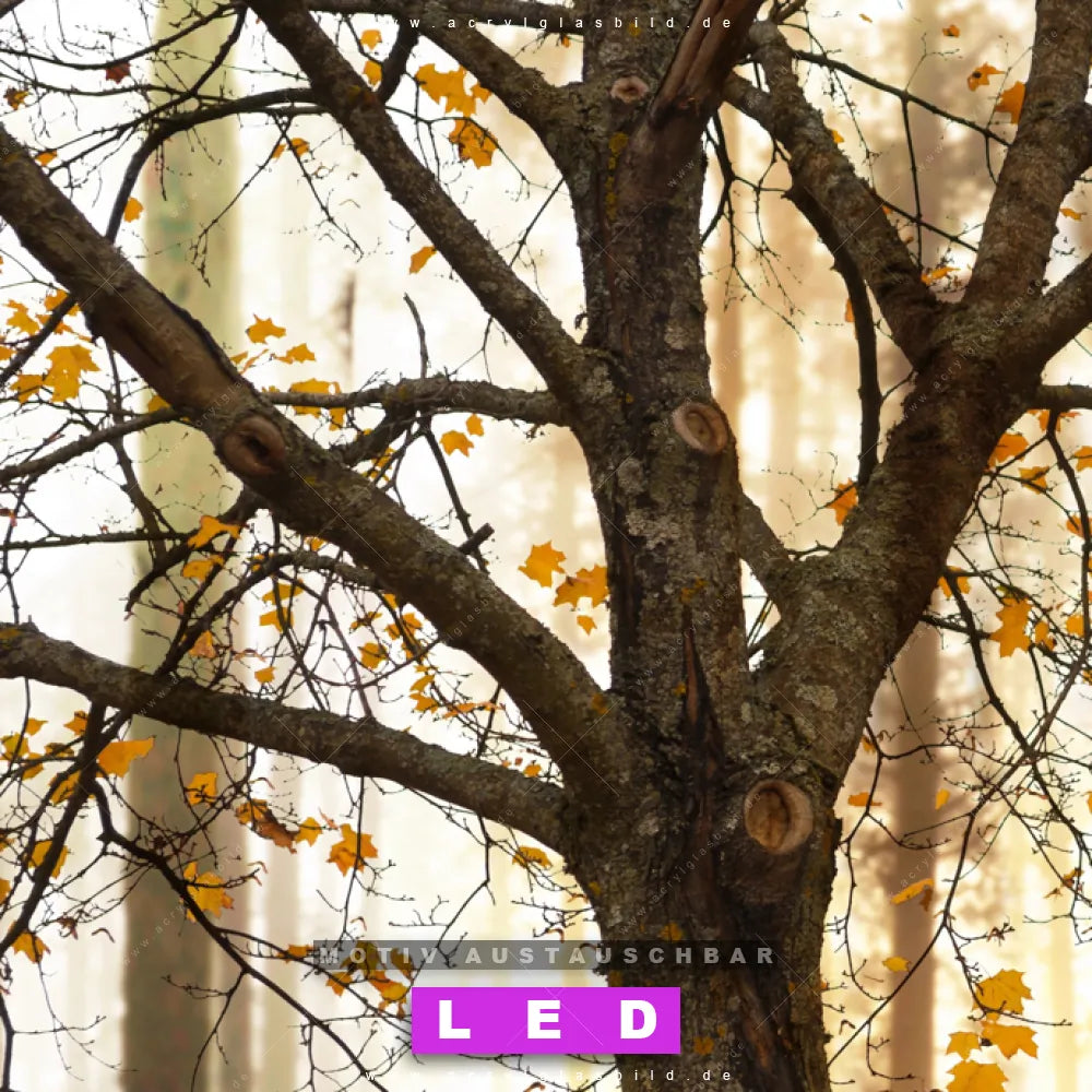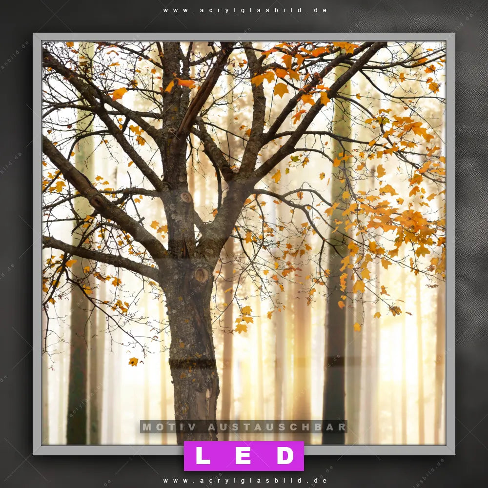 Vergiss dunkle Ecken und Langeweile! Mit unserem Acrylglasbild Baum mit Herbstblättern und seiner brillanten LED-Ausleuchtung wirst du dich nie wieder in der Dunkelheit verirren. Wenn du auf der Suche nach einem beleuchteten Wandbild aus Acrylglas mit Wald, Landschaft, Bäume, Natur, Baum, Buche, Ruhe, Stille bist, ist unser LED Acrylglasbild Canvalight® DIA Morgennebel im Herbst mit den strahlenden Motiv-Farben Braun, Orange genau das richtige Leuchtbild für dich. Das im Retro - Vintage Stil gestaltete LED Bild mit glänzender Front aus Acrylglas passt perfekt zu jedem Einrichtungsstil in – vom minimalistischen Chic bis zum kreativen Chaos.