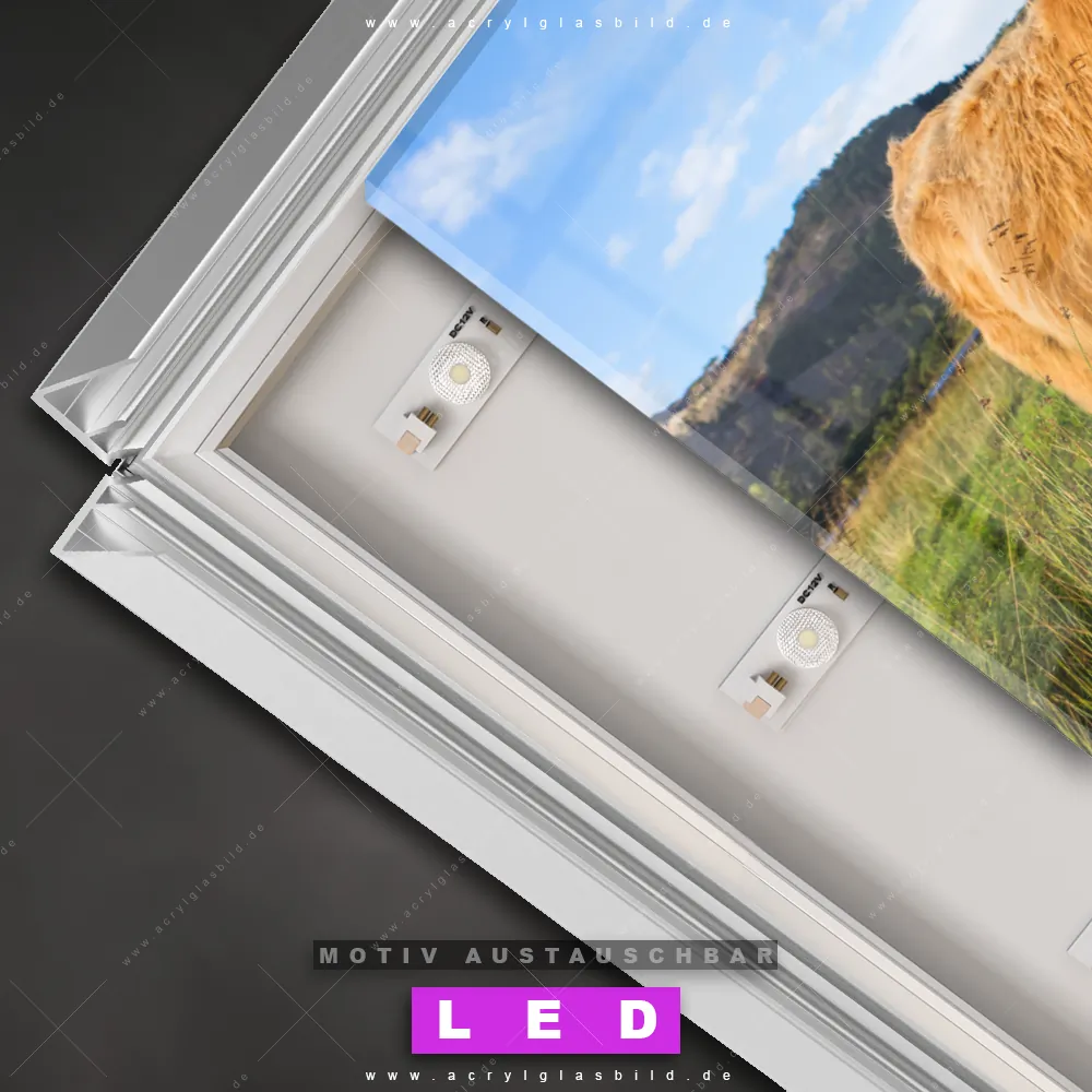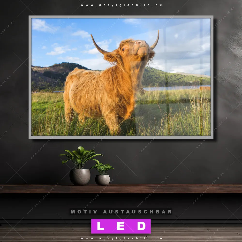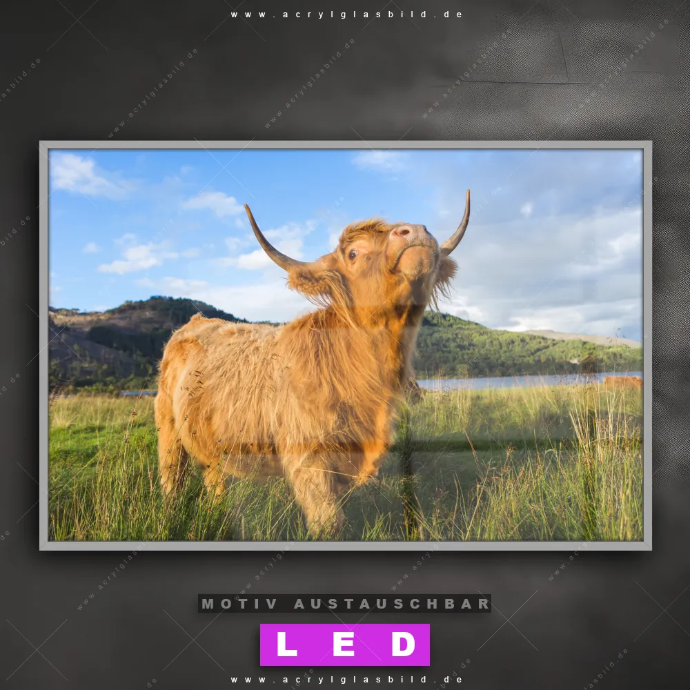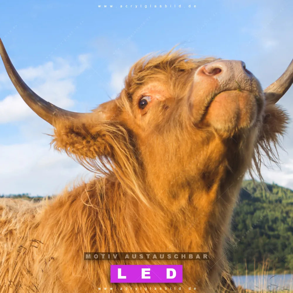 Du bist auf der Suche nach einem dimmbaren Tierwelt LED Bild mit Fernbedienung und optionaler Farbtemperatursteuerung? Dann haben wir hier genau das richtige Wandbild mit LED Beleuchtung für dich: Unser Canvalight® DIA LED Acrylglasbild Hochland-Bulle im Querformat mit austauschbarer bedruckter Acrylglas-Scheibe. Dieses Leuchtbild bringt sofort Partybeleuchtung in deine Räume!
