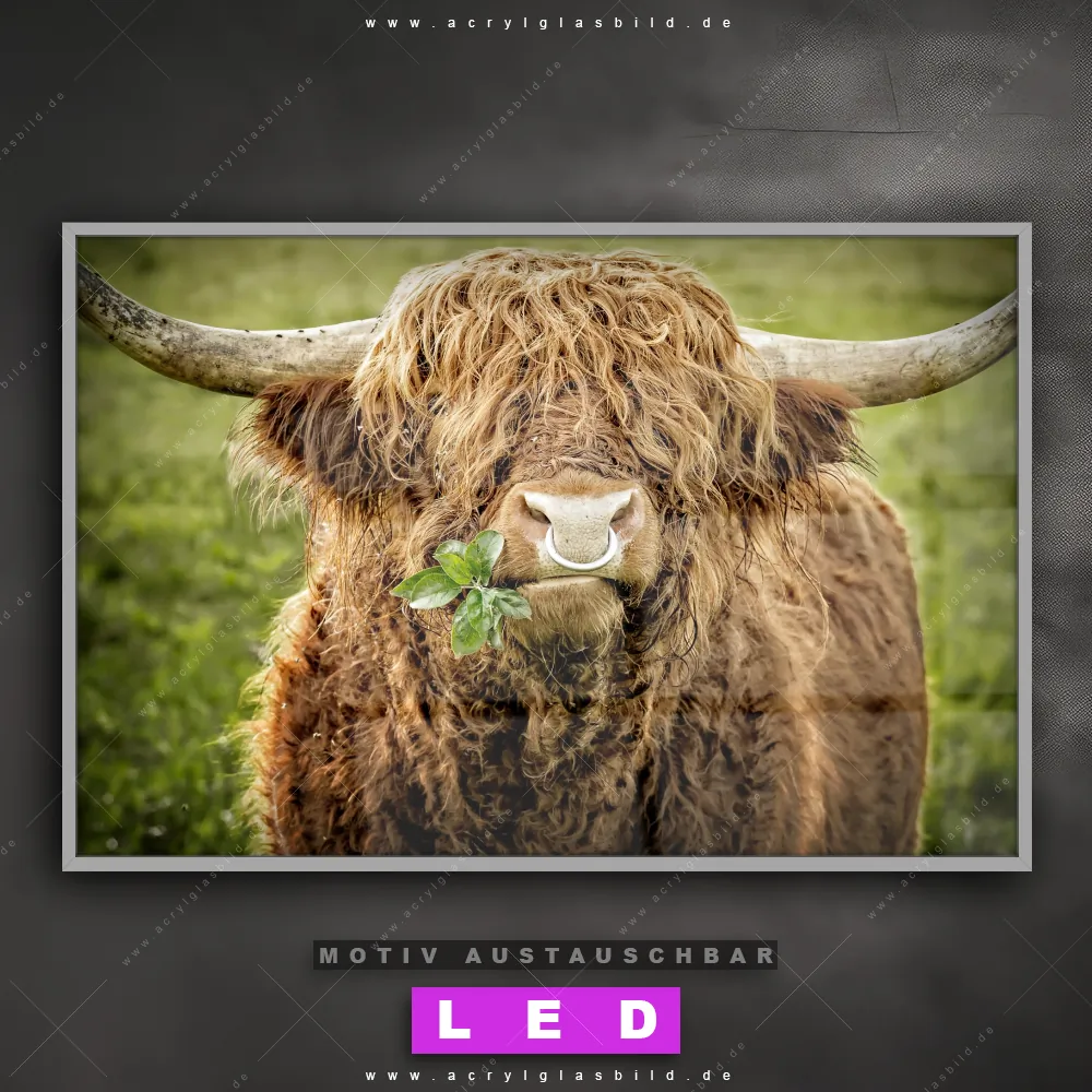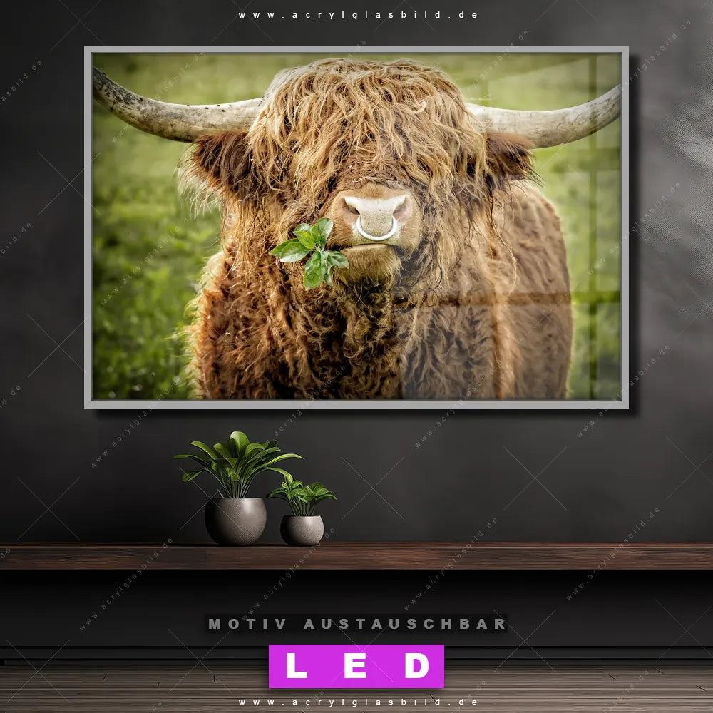 Mit unserem LED Acrylglasbild Canvalight® DIA Hochlandrind mit Pflanze im Maul und seiner genialen LED-Ausleuchtung wirst du nie wieder im Dunkeln auf deinem Sofa herumtappen. Wenn du nach einem beleuchteten Wandbild aus Acrylglas mit Tier, Stier, Hochlandkuh, Highlander, Büffel, Rind, Kuh, Hochlandrind für Bar - Gastronomie, Wohnzimmer - Schlafzimmer suchst, ist unser LED Leuchtbild fressendes Hochlandrind in den beeindruckenden Motiv-Farben Braun, Beige, Grün genau das richtige beleuchtete Wandbild für dich. Gestaltet im Modern Art, Natürlich - Realistisch Stil, passt dieses LED Wandbild mit DIA-Klapprahmen und glänzender Front aus Acrylglas perfekt zu jedem Einrichtungsstil – sogar zu deinem chaotischen kreativen Durcheinander!