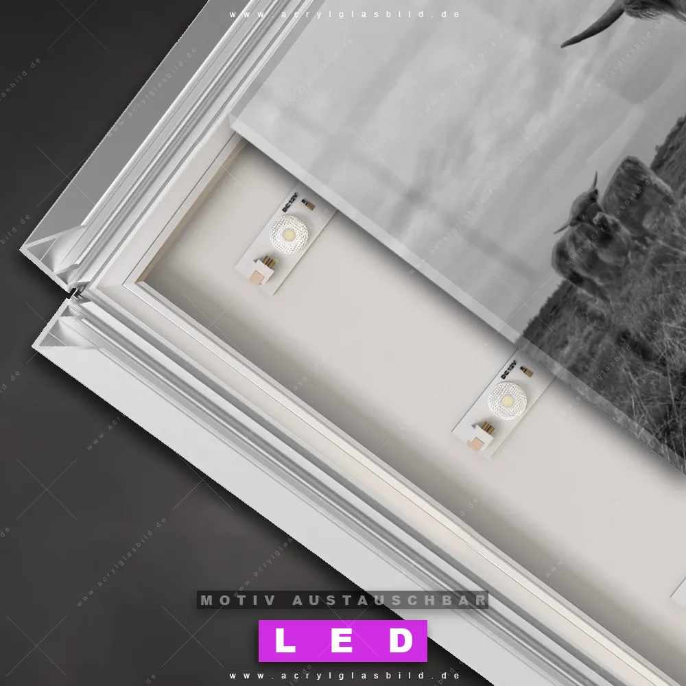 Du bist auf der Suche nach einem dimmbaren Tierwelt LED Bild mit Fernbedienung und optionaler Farbtemperatursteuerung? Dann haben wir hier genau das richtige Wandbild mit LED Beleuchtung für dich: Unser Canvalight® DIA LED Acrylglasbild Hochland-Rind Schwarz-Weiß im Querformat mit austauschbarer bedruckter Acrylglas-Scheibe. Dieses Leuchtbild bringt sofort Partybeleuchtung in deine Räume!