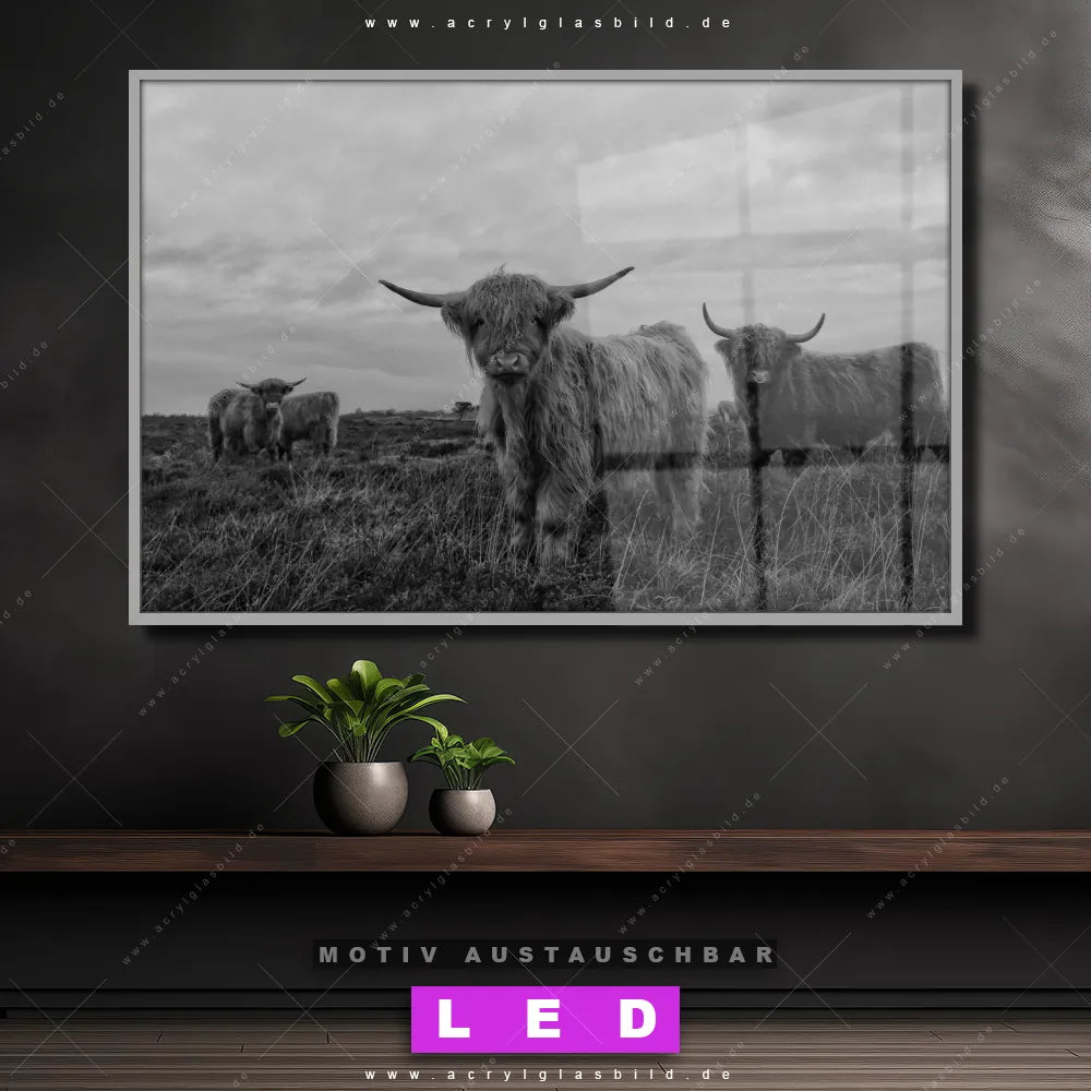 Mit unserem LED Acrylglasbild Canvalight® DIA Hochlandrinder auf der Wiese und seiner genialen LED-Ausleuchtung wirst du nie wieder im Dunkeln auf deinem Sofa herumtappen. Wenn du nach einem beleuchteten Wandbild aus Acrylglas mit Tier, Stier, Hochlandkuh, Highlander, Büffel, Rind, Bulle, Hochlandrind für Bar - Gastronomie, Wohnzimmer - Schlafzimmer, Küche - Esszimmer suchst, ist unser LED Leuchtbild Herde von Hochlandrindern in den beeindruckenden Motiv-Farben Schwarz, Weiss genau das richtige beleuchtete Wandbild für dich. Gestaltet im Natürlich - Realistisch Stil, passt dieses LED Wandbild mit DIA-Klapprahmen und glänzender Front aus Acrylglas perfekt zu jedem Einrichtungsstil – sogar zu deinem chaotischen kreativen Durcheinander!