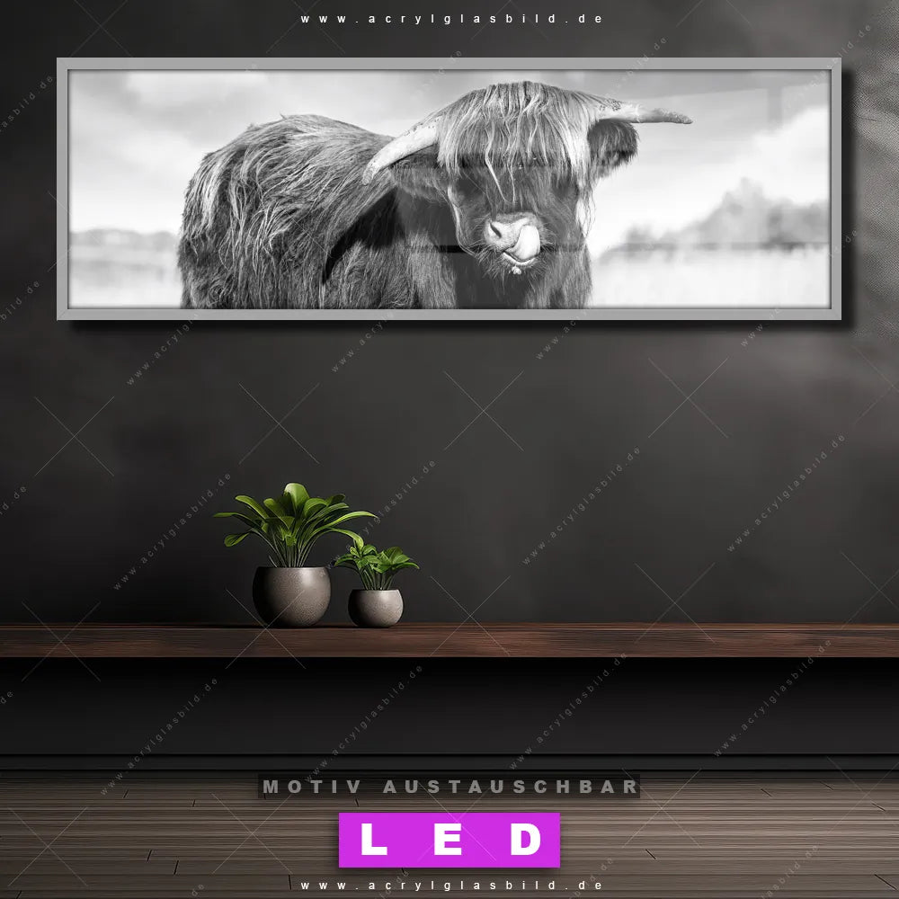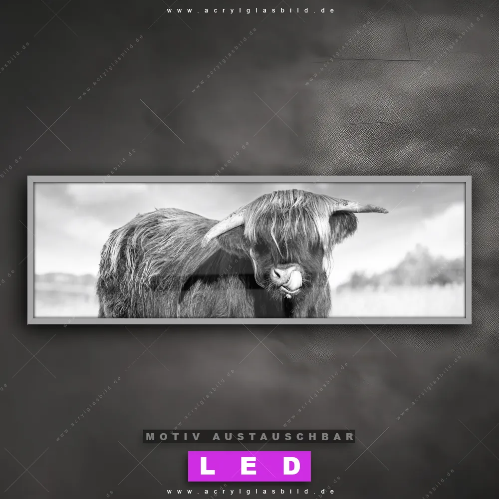 Wer will schon dunkle, triste Wände? Mit unserem LED Acrylglasbild Canvalight® DIA Highlandrind zeigt Zunge und seiner fantastischen LED-Ausleuchtung werden deine Wände in Bar - Gastronomie, Wohnzimmer - Schlafzimmer, Küche - Esszimmer zu echten Hinguckern. Wenn du auf der Suche nach einem beleuchteten Wandbild aus Acrylglas mit Tier, Stier, Hochlandkuh, Highlander, Büffel, Rind, Bulle, Hochlandrind, Kuh, Wiese, Weide, Hörner bist, dann solltest du unser LED Leuchhtbild Hochlandkuh schwarz-weiß mit den beeindruckenden Motiv-Farben Schwarz, Weiss nicht verpassen. Gestaltet im angesagten Natürlich - Realistisch, Modern Art, Schwarz - Weiss Stil, passt das LED Bild mit DIA-Klapprahmen und wechselbarer Acrylglas-Scheibe perfekt zu jedem Einrichtungsstil – selbst in deinem kleinen Dschungel aus Kreativität und Chaos!
