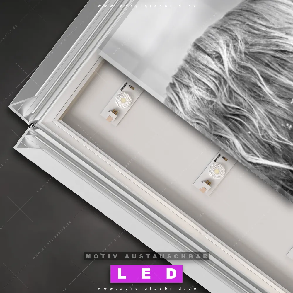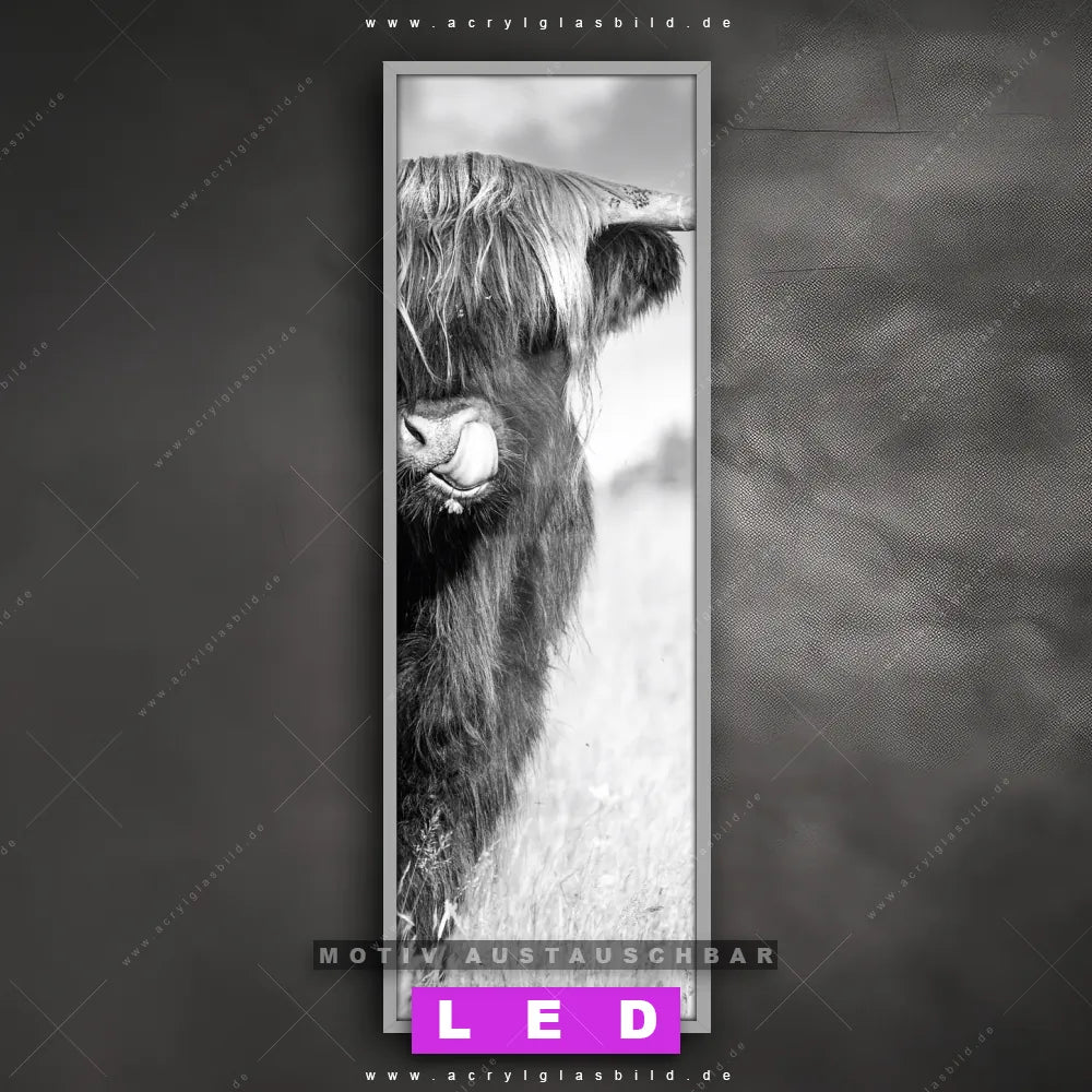 Bist du bereit, deine Wände mit einem dimmbaren LED Bild mit Fernbedienung und optionaler Farbtemperatursteuerung auf das nächste Level zu bringen? Unser Tierwelt Canvalight® DIA LED Acrylglasbild ist genau das, was du brauchst! Das Wandbild mit LED Beleuchtung im Schmalen Format mit austauschbarer bedruckter Acrylglas-Scheibe Hochlandkuh auf einer Wiese bringt Licht und Stil in dein Zuhause – und das in null Komma nichts!