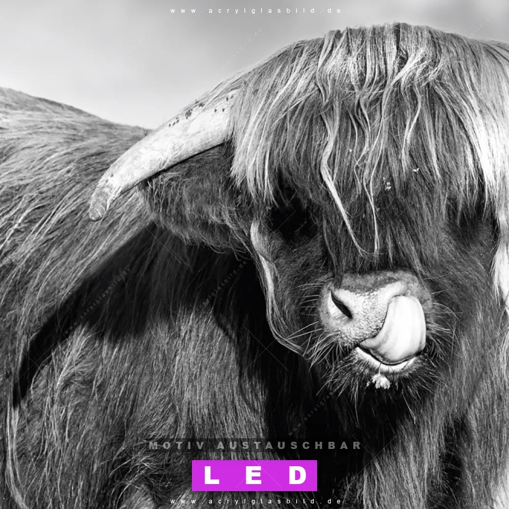 Vergiss dunkle Ecken und langweilige Wände in Bar - Gastronomie, Wohnzimmer - Schlafzimmer, Küche - Esszimmer! Mit unserem LED Acrylglasbild Canvalight® DIA Highlandrind zeigt Zunge wirst du nie wieder im Dunkeln tappen. Suchst du nach einem beleuchteten Wandbild mit Tier, Stier, Hochlandkuh, Highlander, Büffel, Rind, Bulle, Hochlandrind, Kuh, Wiese, Weide, Hörner? Dann ist unser Leuchtbild Hochlandkuh schwarz-weiß mit den strahlenden Motiv-Farben Schwarz, Weiss genau das richtige LED Bild für dich. Egal, ob dein Stil minimalistisch oder exotisch ist, dieses LED Leuchtbild im Natürlich - Realistisch, Modern Art, Schwarz - Weiss Stil mit DIA-Klapprahmen und glänzender Front aus Acrylglas passt perfekt zu jeder Einrichtung.